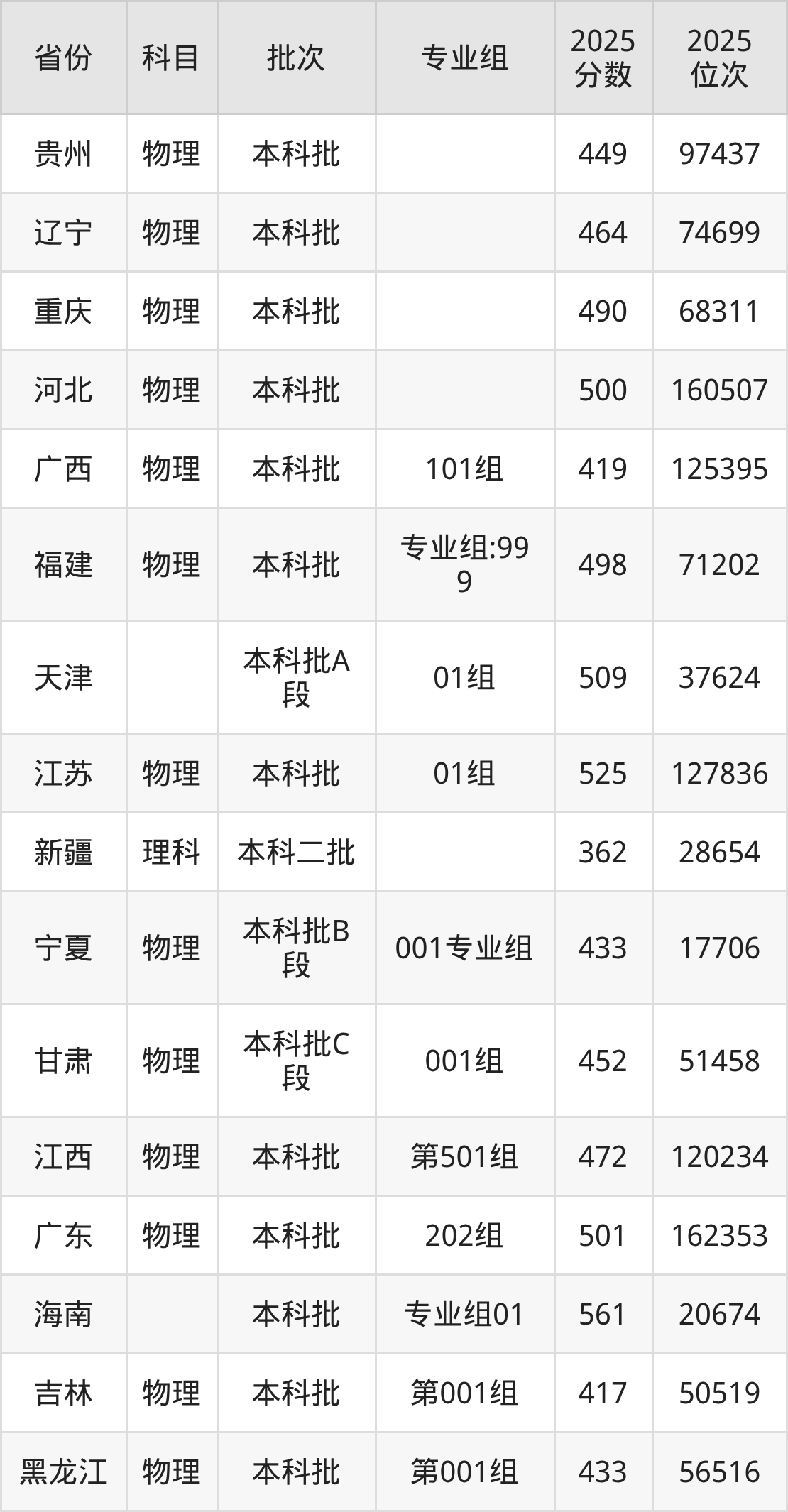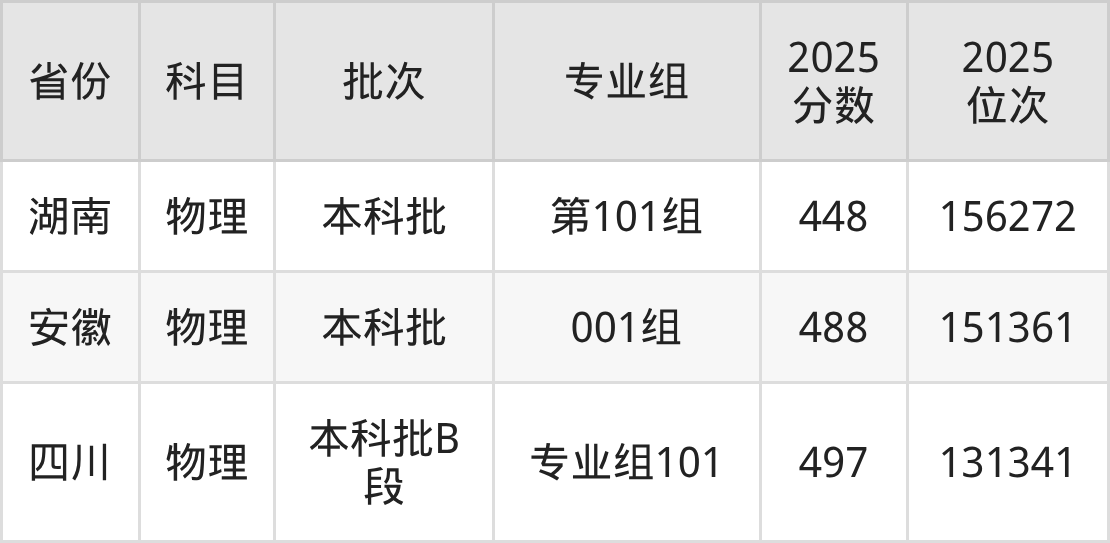 2025年在本科物理类进行招生,各专业组分数线详情如下: