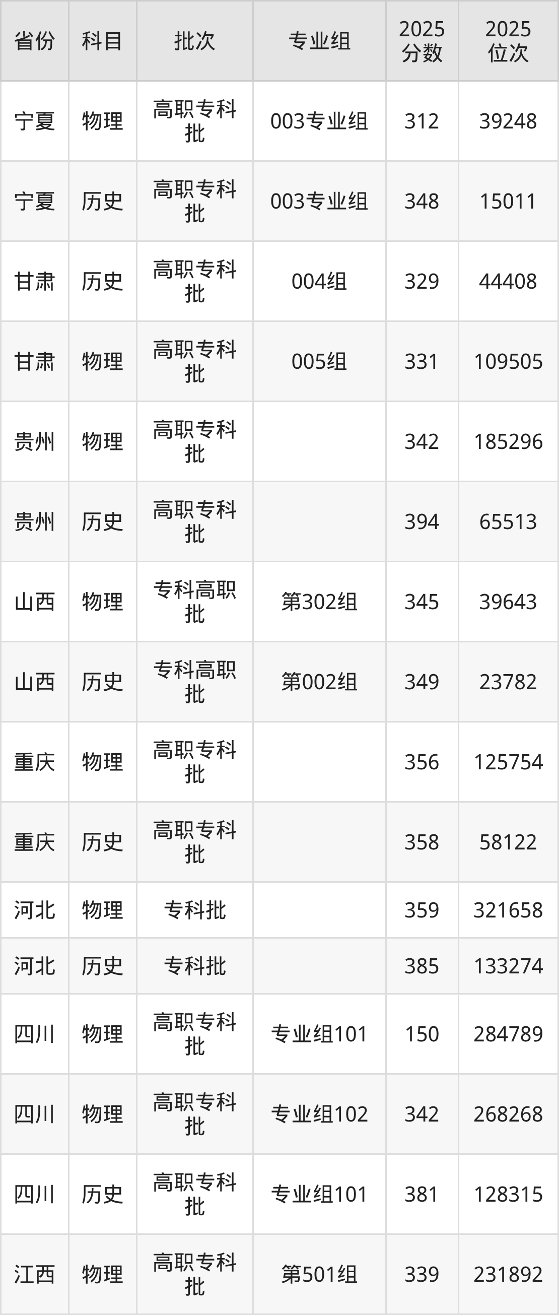 普通类专科历史类最低394分,专科物理类最低342分