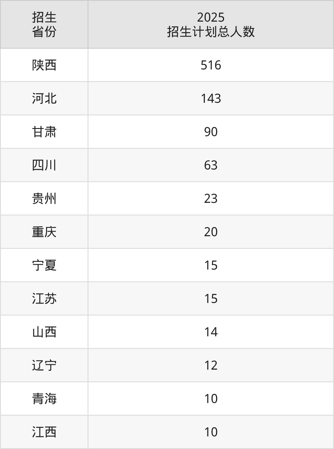 2025年延安职业技术学院面向全国12个省市开展专科招生;招生专业共41个,招生人数共931人。2025年在陕西省招生计划总人数是516人,其中,延安职业技术学院在陕西省招生人数最多的是消防救援技术。延安职业技术学院在各省具体招生人数情况如下表。
