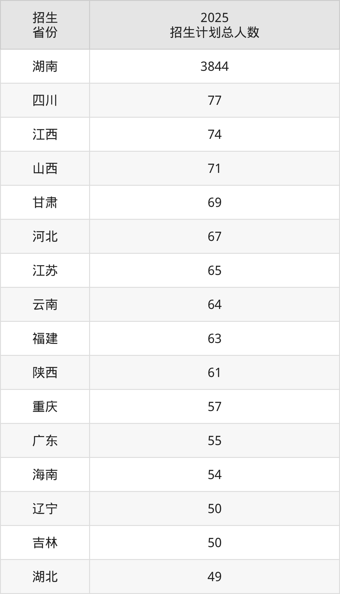 2025年邵阳学院面向全国27个省市开展本科招生;招生专业共44个,招生人数共5111人。2025年在湖南省招生计划总人数是3844人,其中,邵阳学院在湖南省招生人数最多的是机械设计制造及其自动化。邵阳学院在各省具体招生人数情况如下表。