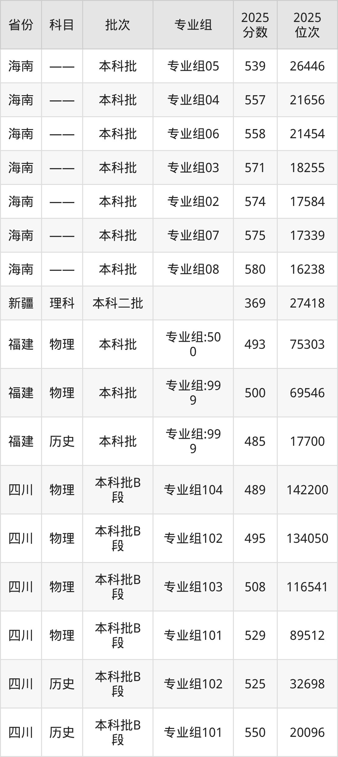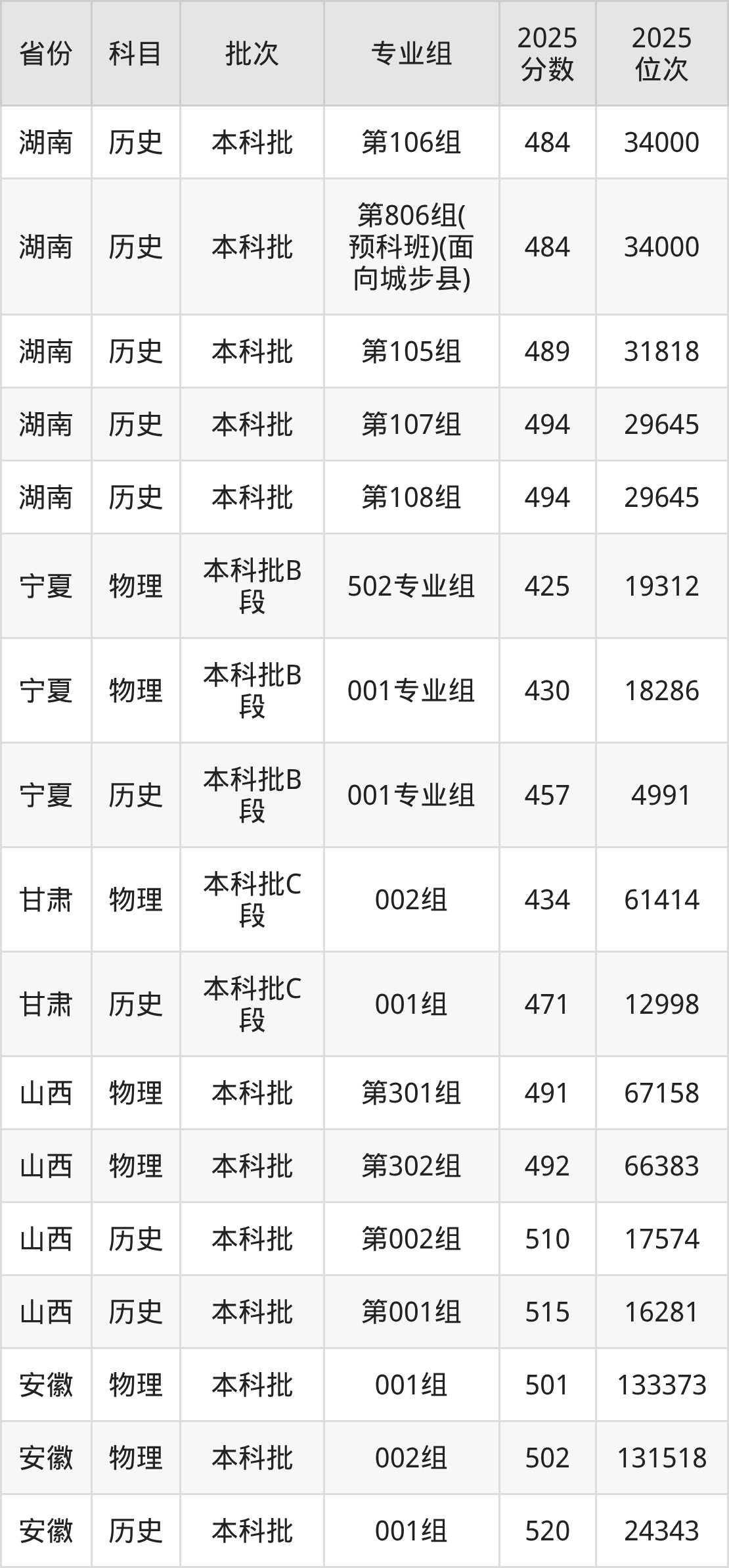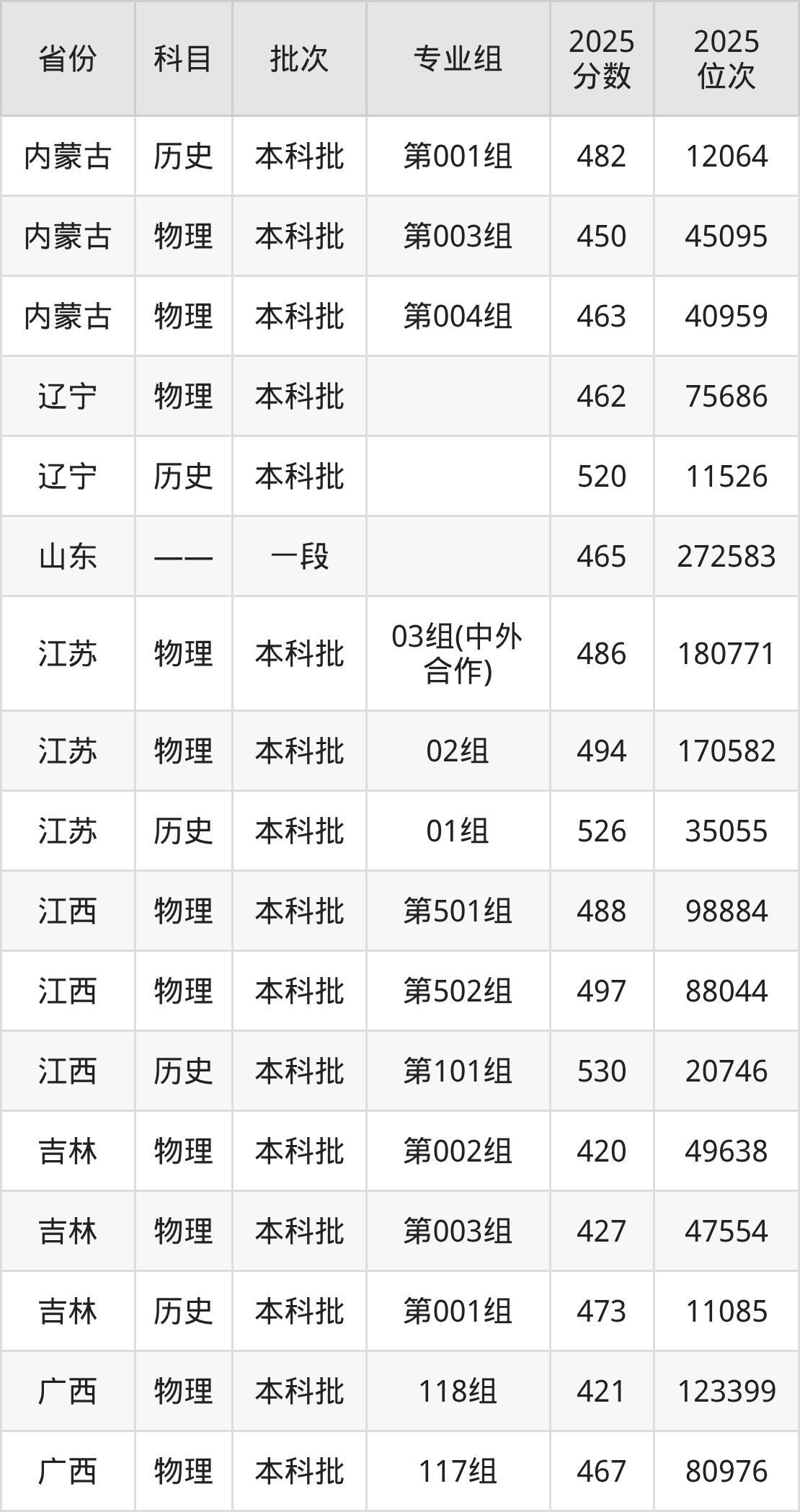 2025年在本科物理类进行招生,各专业组分数线详情如下: