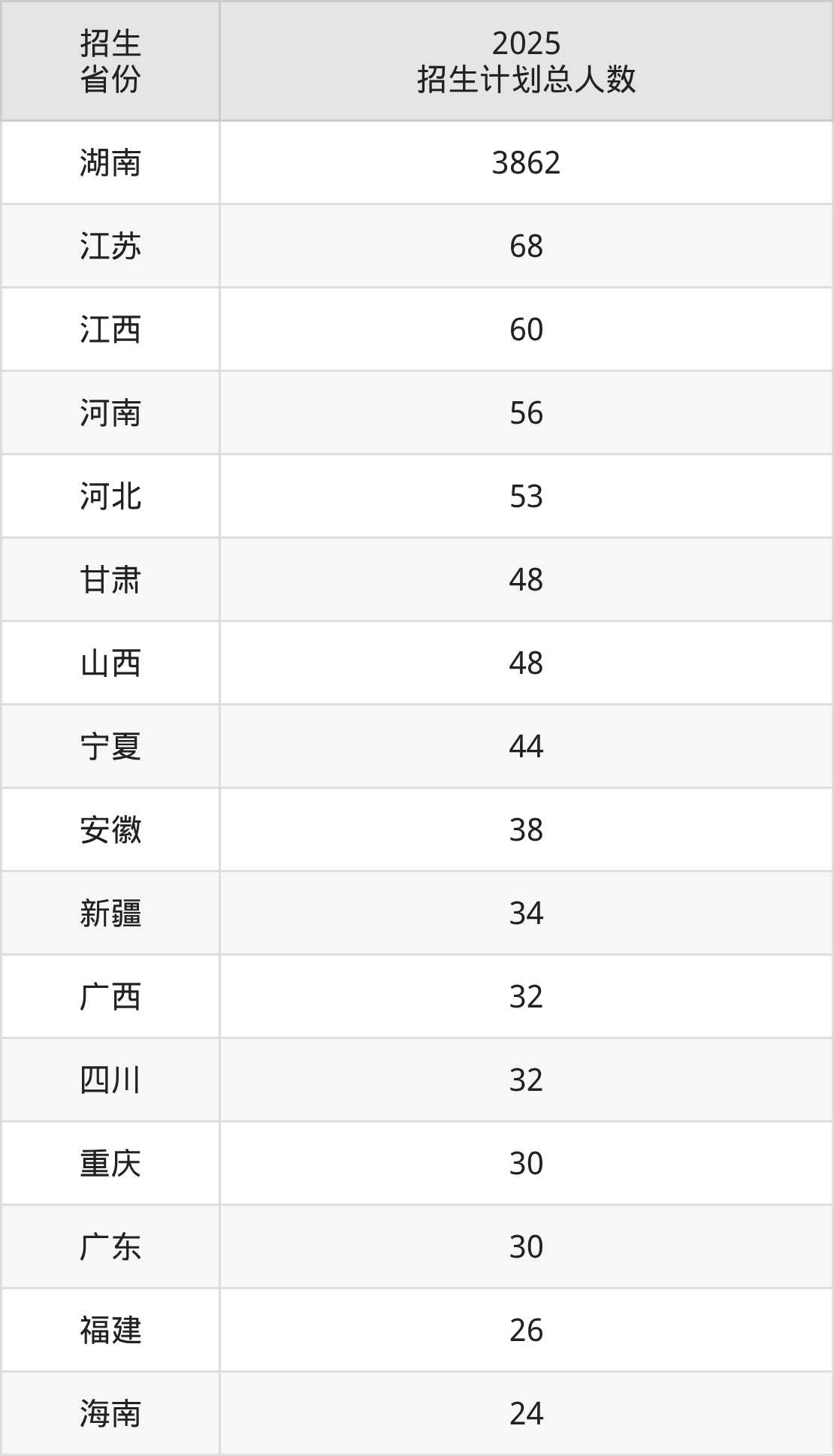2025年湖南城市学院面向全国28个省市开展本科招生;招生专业共43个,招生人数共4682人。2025年在湖南省招生计划总人数是3862人,其中,湖南城市学院在湖南省招生人数最多的是土木工程。湖南城市学院在各省具体招生人数情况如下表。
