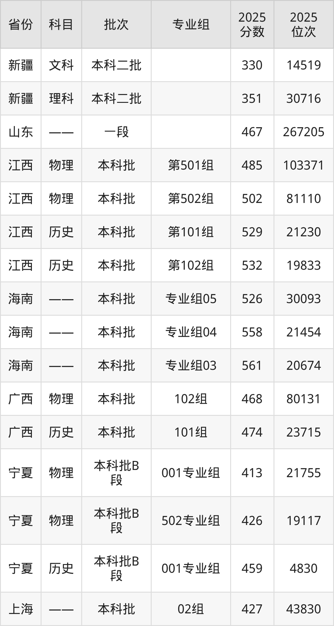 2025年湖南城市学院全国录取分数线是330分到561分,录取最低在新疆文科、录取最高在海南(专业组03)。各省各专业组最低分具有差异,详情如下:
