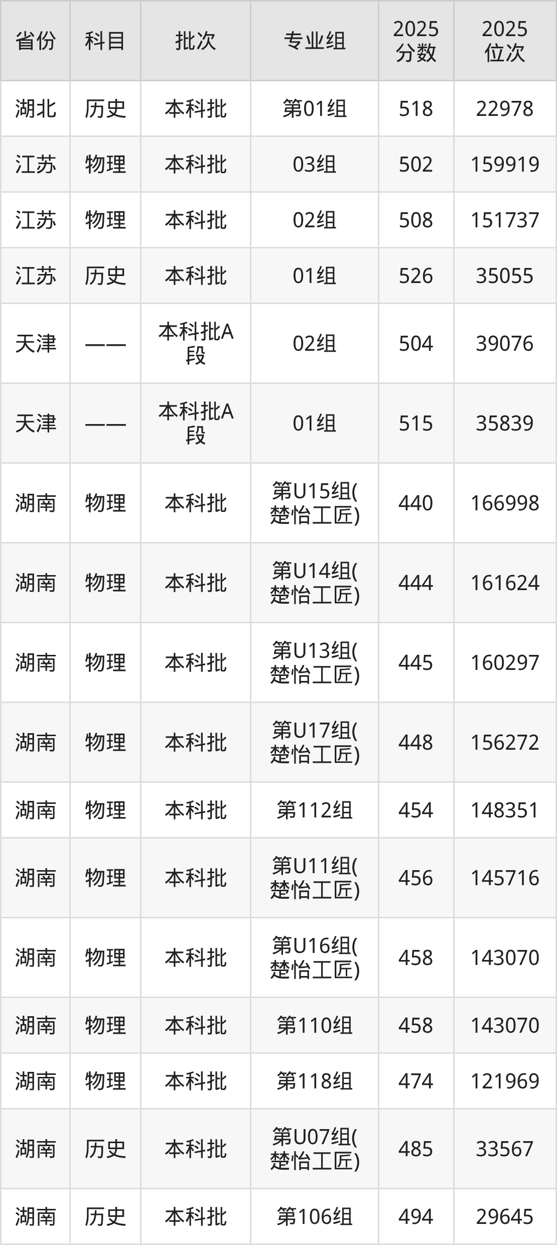 湖南城市学院第U07组(楚怡工匠):2025年投档录取最低分为485分,录取最低位次为33567名。