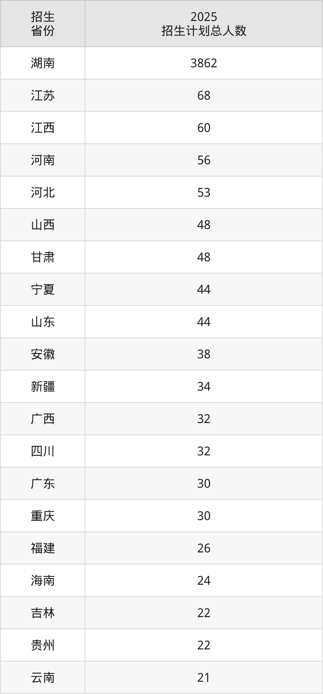 2025年湖南城市学院面向全国29个省市开展本科招生;招生专业共43个,招生人数共4726人。2025年在湖南省招生计划总人数是3862人,其中,湖南城市学院在湖南省招生人数最多的是土木工程。湖南城市学院在各省具体招生人数情况如下表。