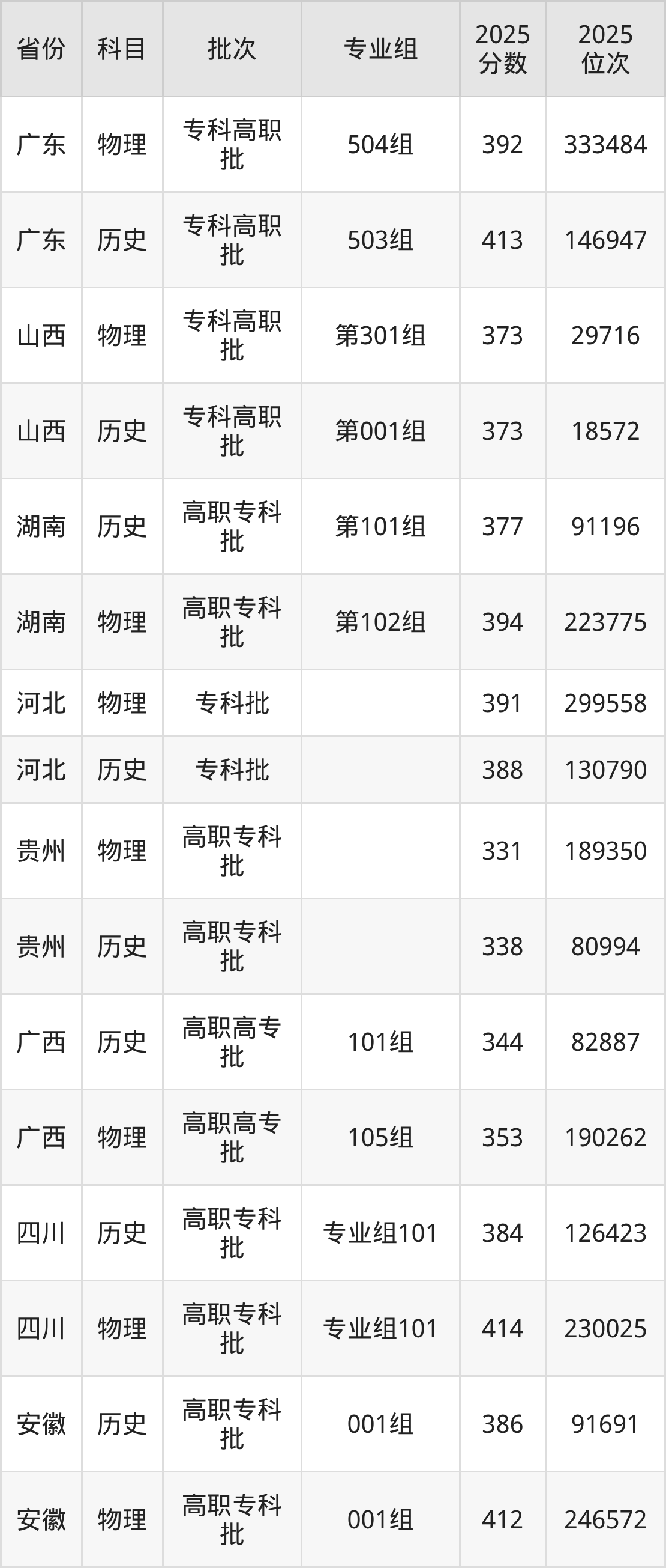 普通类专科历史类最低377分,专科物理类最低394分