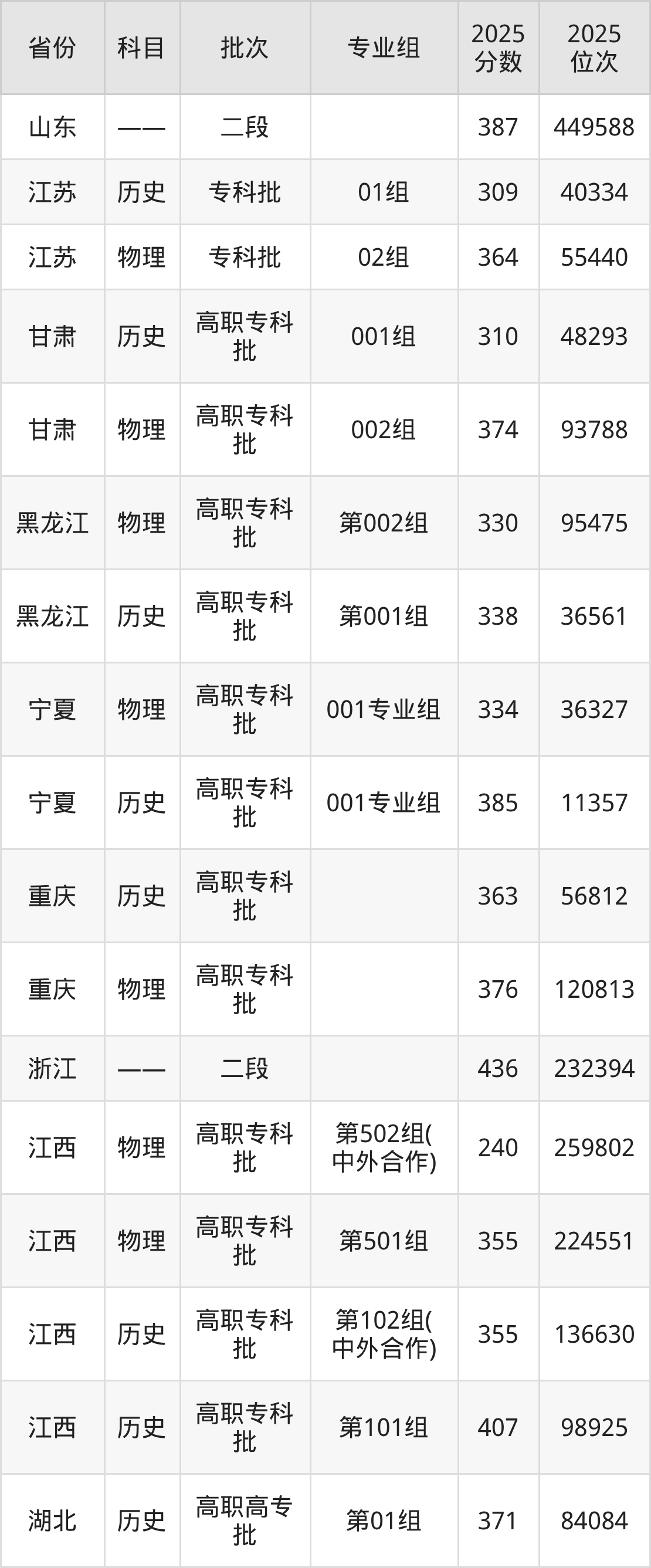 江西机电职业技术学院第001组:2025年投档录取最低分为373分,录取最低位次为18572名。