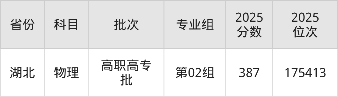 江西机电职业技术学院第02组:2025年投档录取最低分为387分,录取最低位次为175413名。