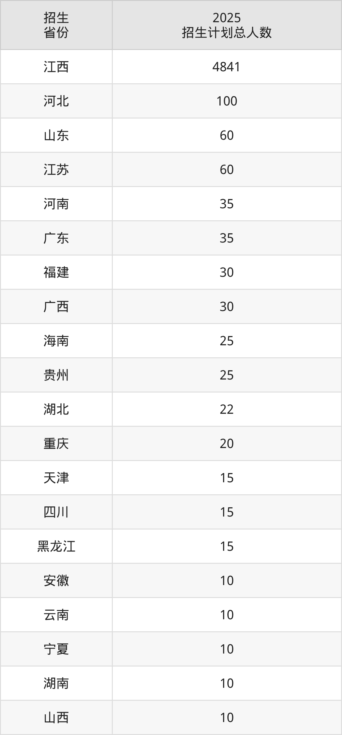 2025年江西机电职业技术学院面向全国22个省市开展专科招生;招生专业共45个,招生人数共5396人。2025年在江西省招生计划总人数是4841人,其中,江西机电职业技术学院在江西省招生人数最多的是人工智能技术应用。江西机电职业技术学院在各省具体招生人数情况如下表。