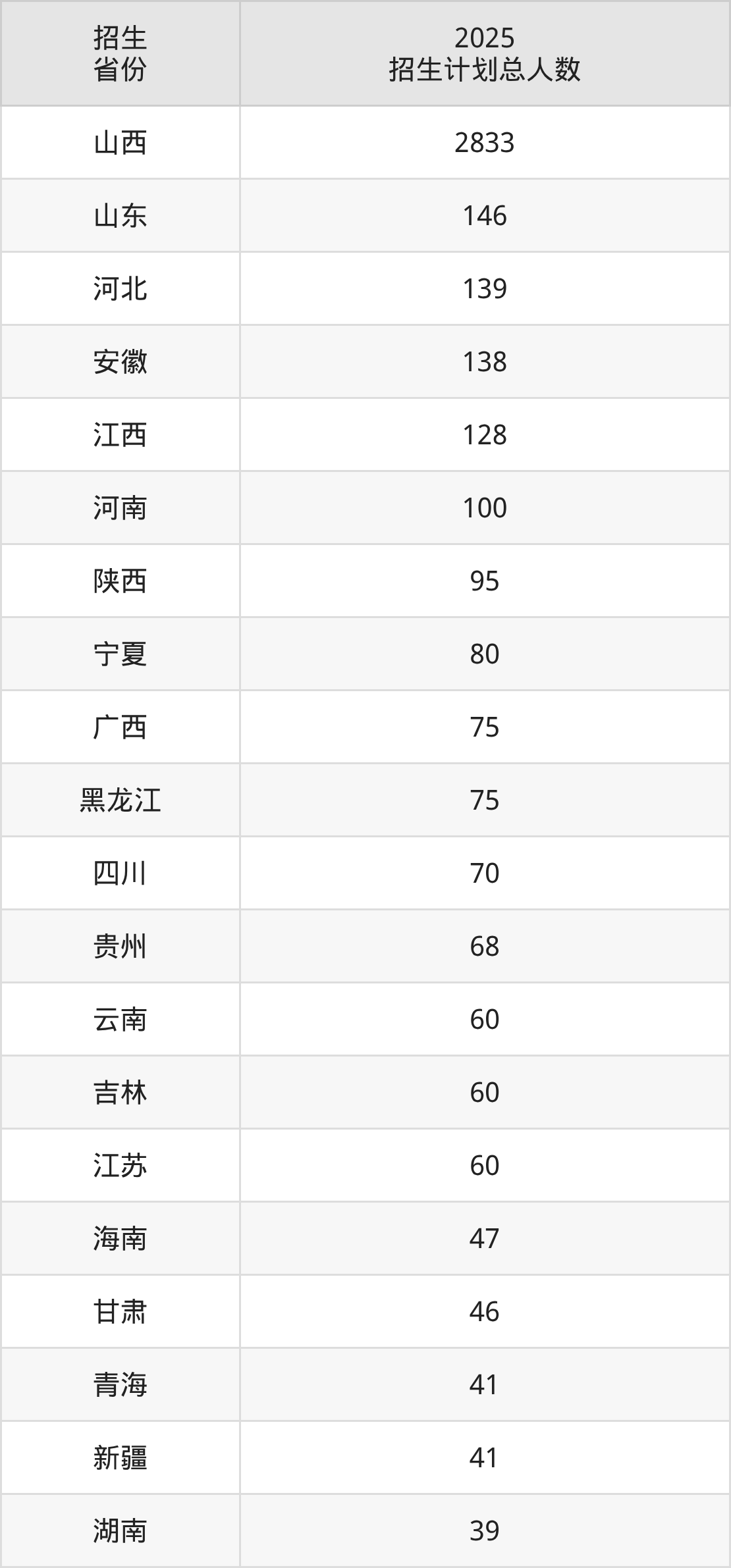 2025年山西财经大学面向全国29个省市开展本科招生;招生专业共49个,招生人数共4562人。2025年在山西省招生计划总人数是2833人,其中,山西财经大学在山西省招生人数最多的是经济学。山西财经大学在各省具体招生人数情况如下表。