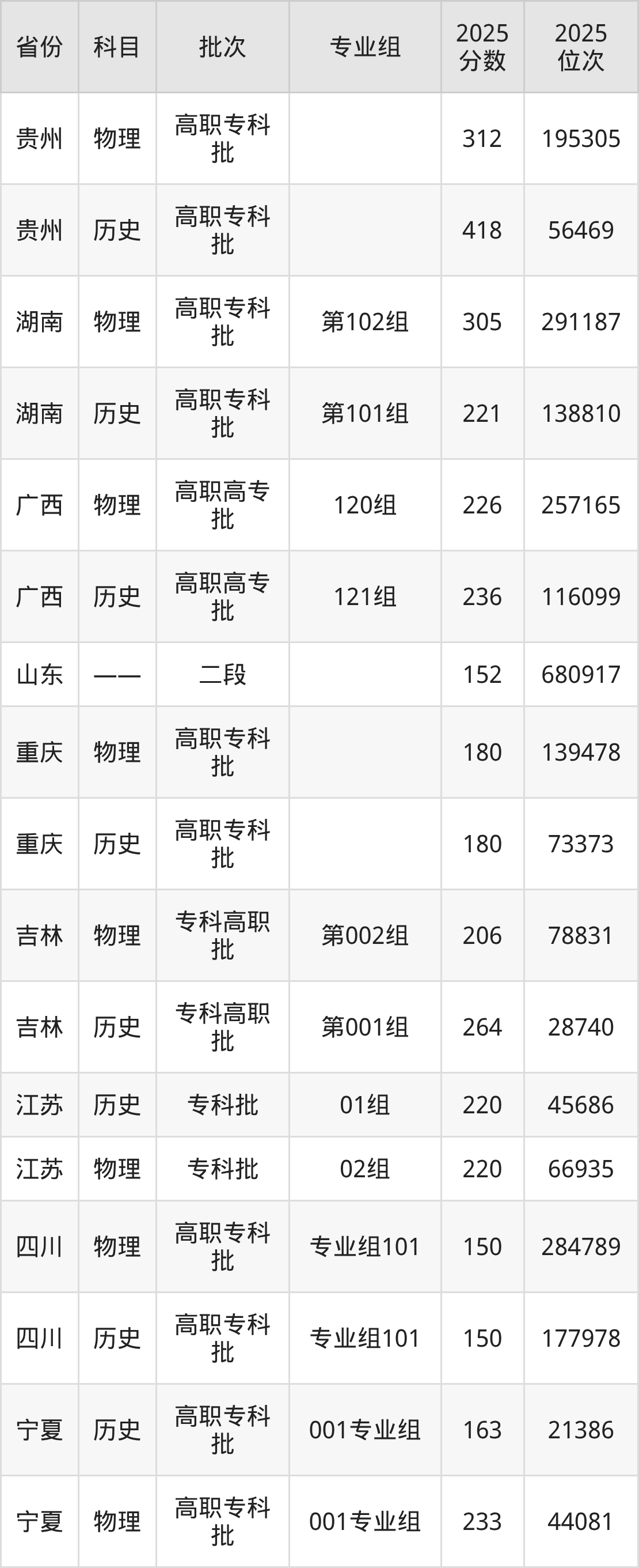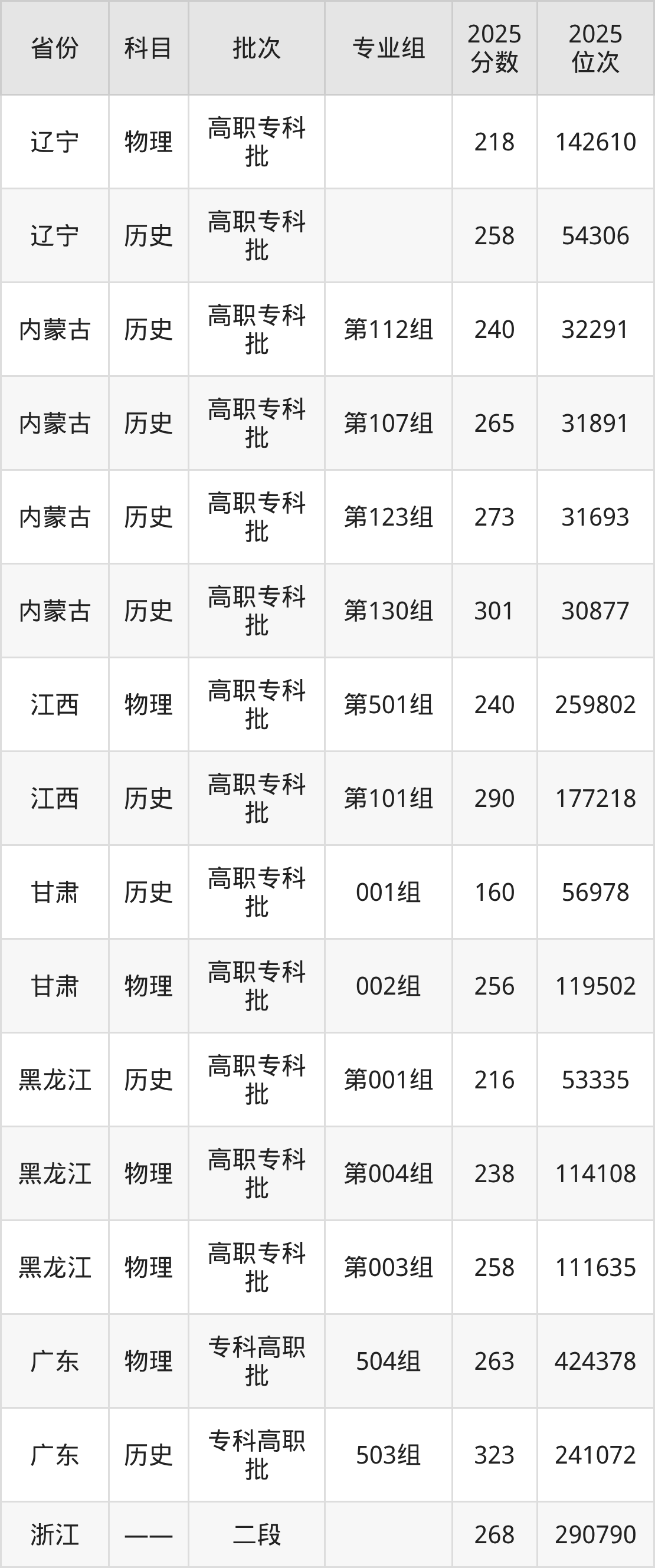 普通类专科历史类最低160分,专科物理类最低256分