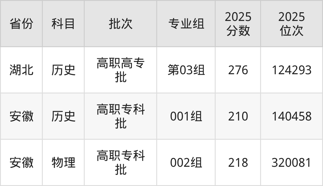 2025年在专科历史类进行招生,各专业组分数线详情如下: