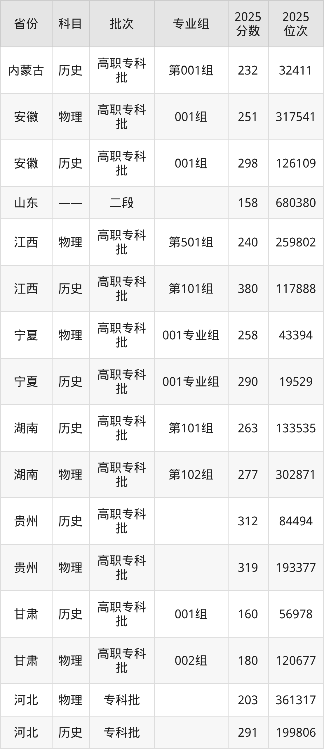 普通类专科物理类最低251分,专科历史类最低298分