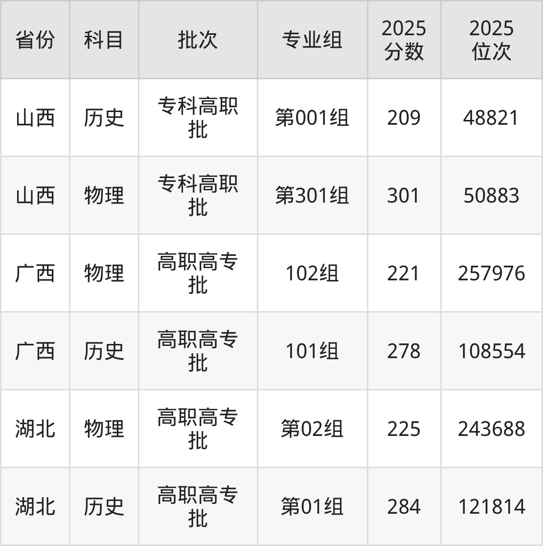 普通类专科物理类最低301分,专科历史类最低209分