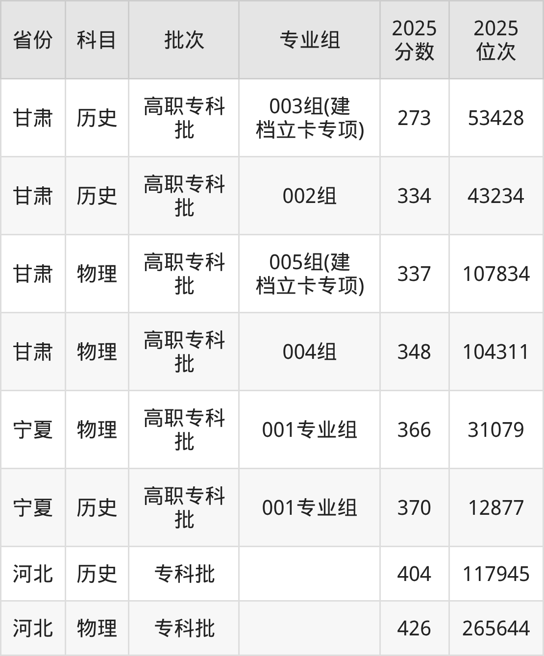 兰州航空职业技术学院005专业组(建档立卡专项):2025年投档录取最低分为337分,录取最低位次为107834名。