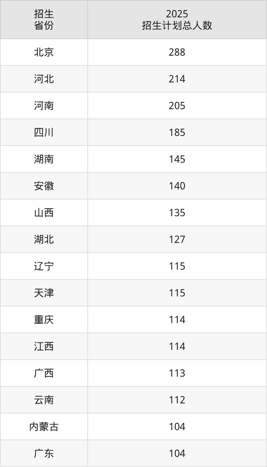 2025年中国农业大学面向全国28个省市开展本科招生;招生专业共48个,招生人数共3045人。2025年在北京市招生计划总人数是288人,其中,中国农业大学在北京市招生人数最多的是国际经济与贸易。中国农业大学在各省具体招生人数情况如下表。