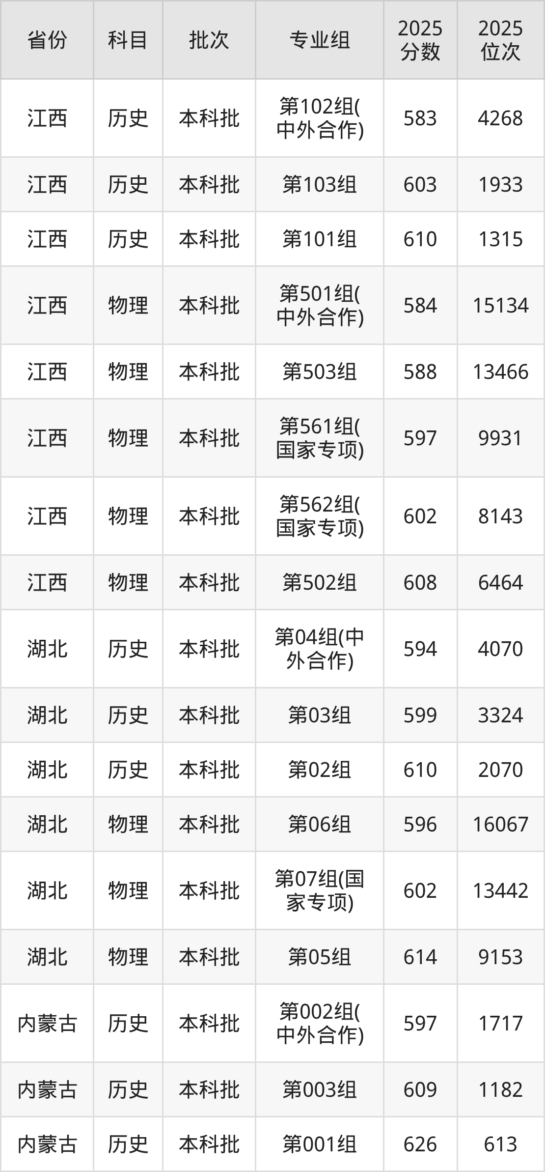 中国农业大学第002组(中外合作):2025年投档录取最低分为597分,录取最低位次为1717名。