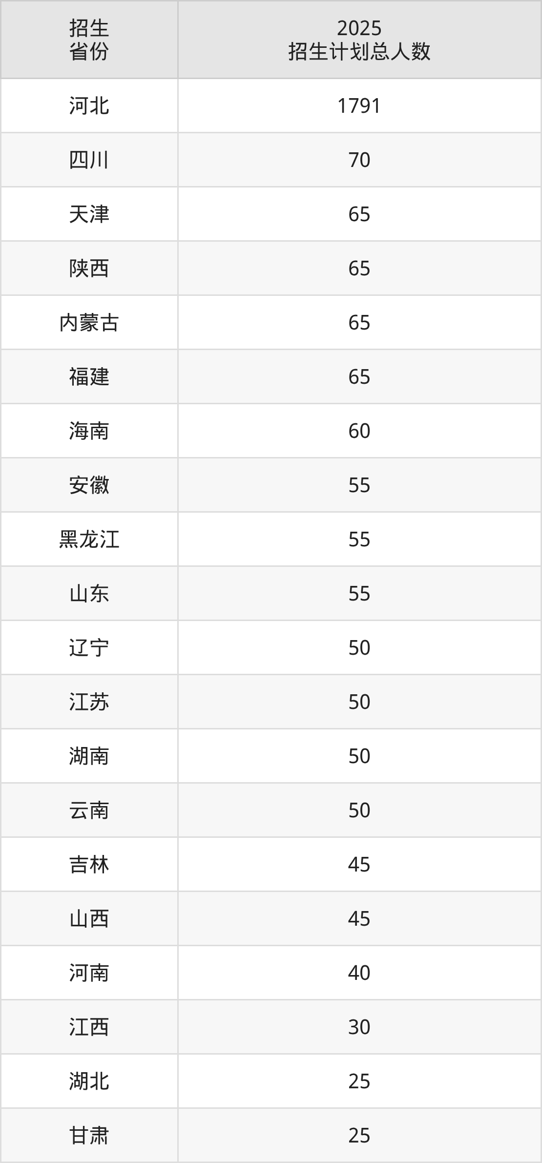 2025年北华航天工业学院面向全国26个省市开展本科招生;招生专业共40个,招生人数共2857人。2025年在河北省招生计划总人数是1791人,其中,北华航天工业学院在河北省招生人数最多的是计算机科学与技术。北华航天工业学院在各省具体招生人数情况如下表。