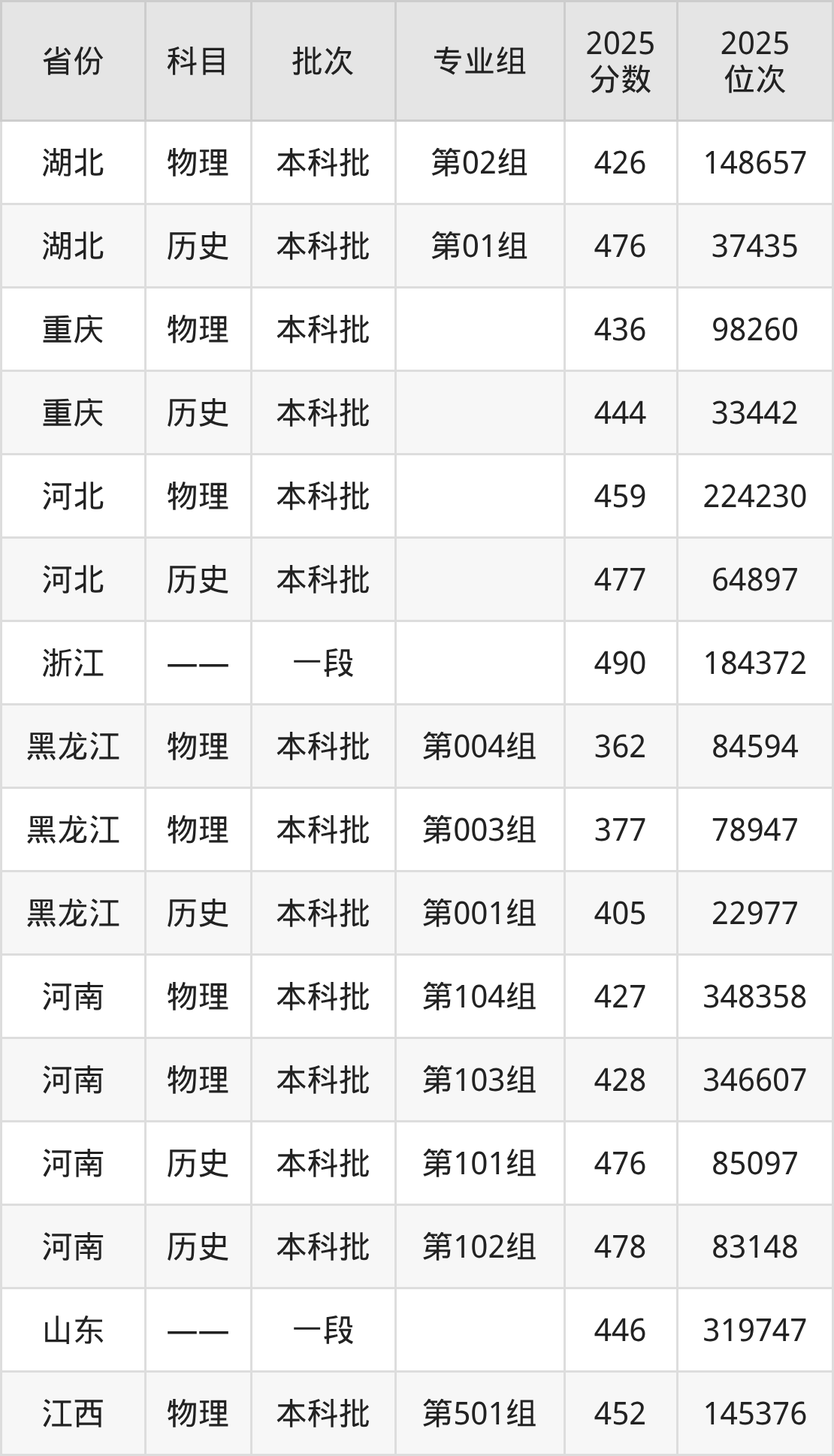 2025年投档录取最低分为463分,录取最低位次为36725名。