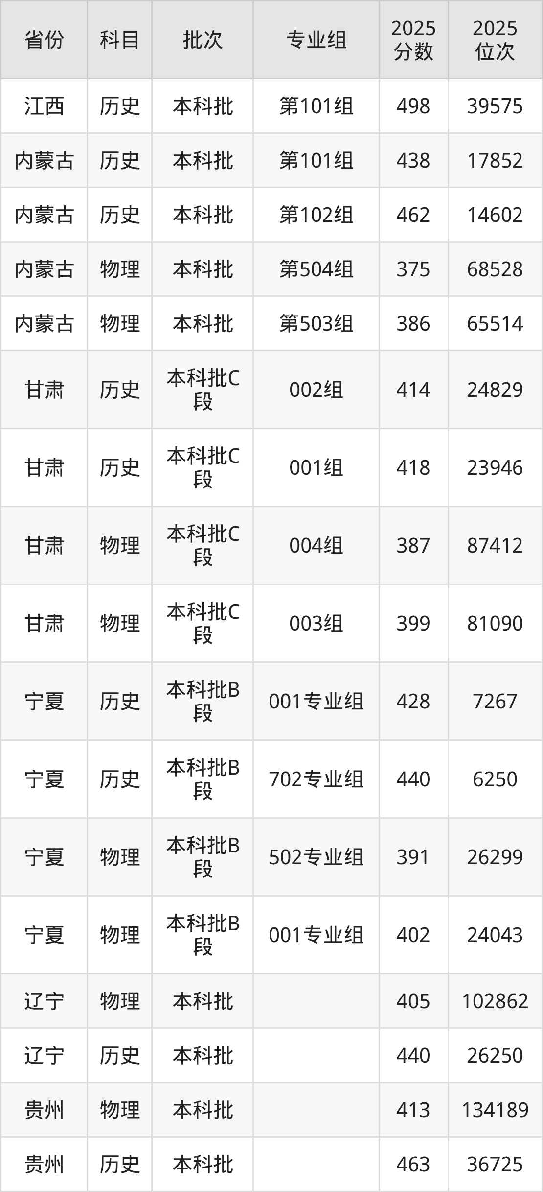 2025年宁夏理工学院全国录取分数线是361分到498分,录取最低在吉林物理类(第008组)、录取最高在江西历史类(第101组)。各省各专业组最低分具有差异,详情如下: