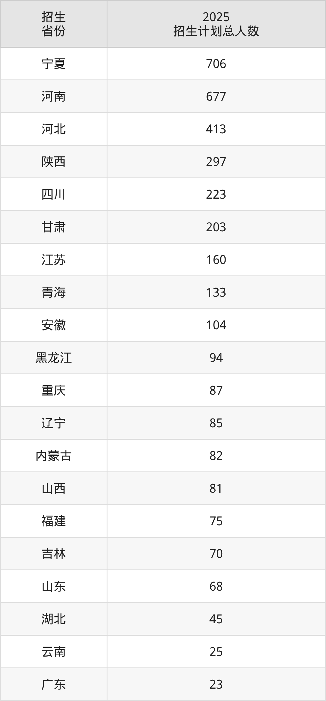 2025年宁夏理工学院面向全国23个省市开展本科招生;招生专业共32个,招生人数共3709人。2025年在宁夏回族自治区招生计划总人数是706人,其中,宁夏理工学院在宁夏回族自治区招生人数最多的是计算机类。宁夏理工学院在各省具体招生人数情况如下表。