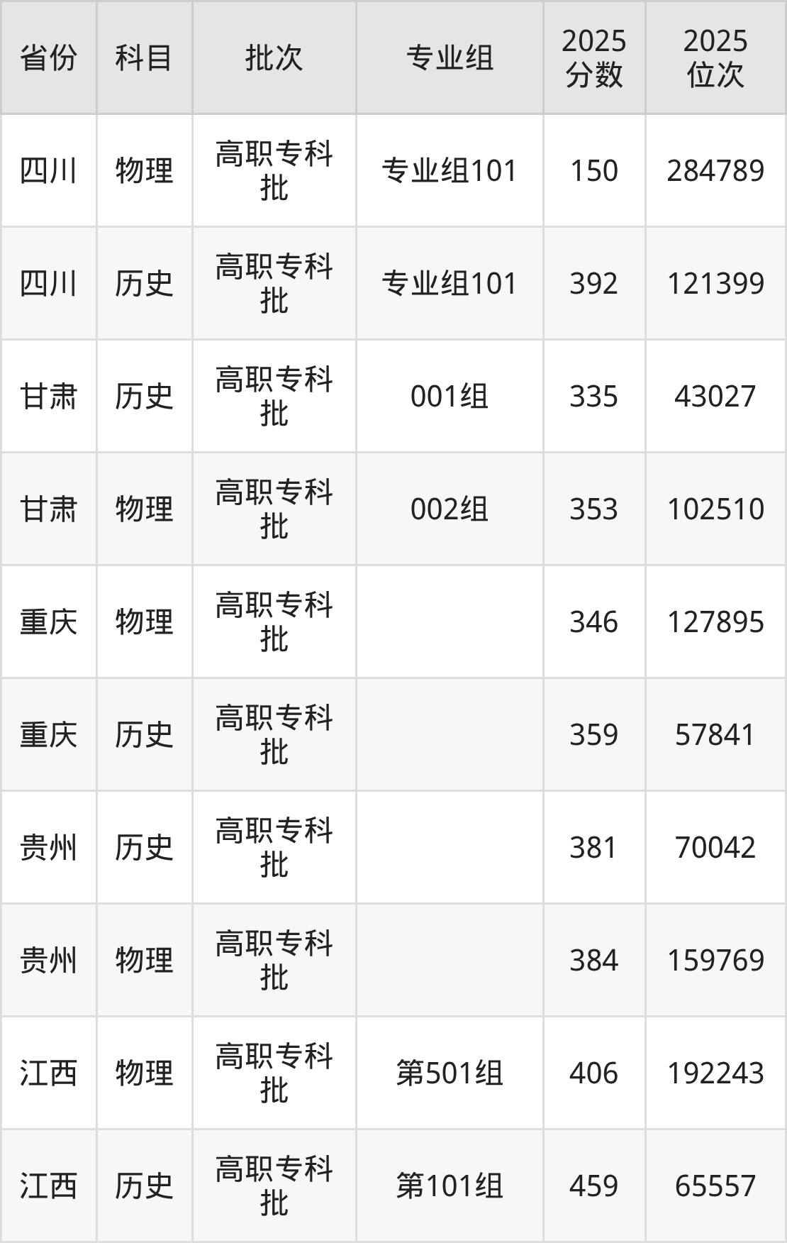 2025年重庆工贸职业技术学院全国录取分数线是150分到459分,录取最低在四川物理类(专业组101)、录取最高在江西历史类(第101组)。各省各专业组最低分具有差异,详情如下: