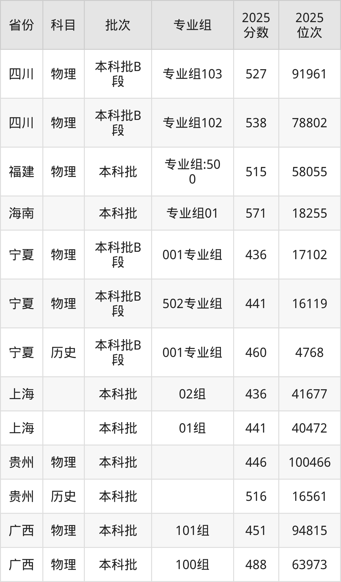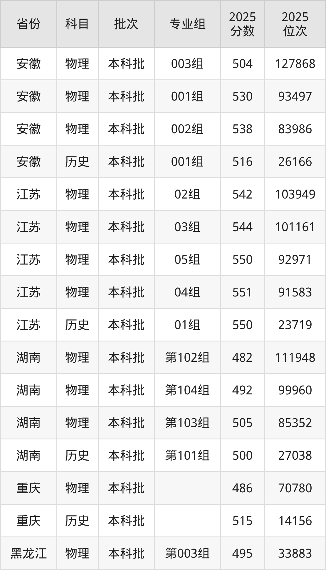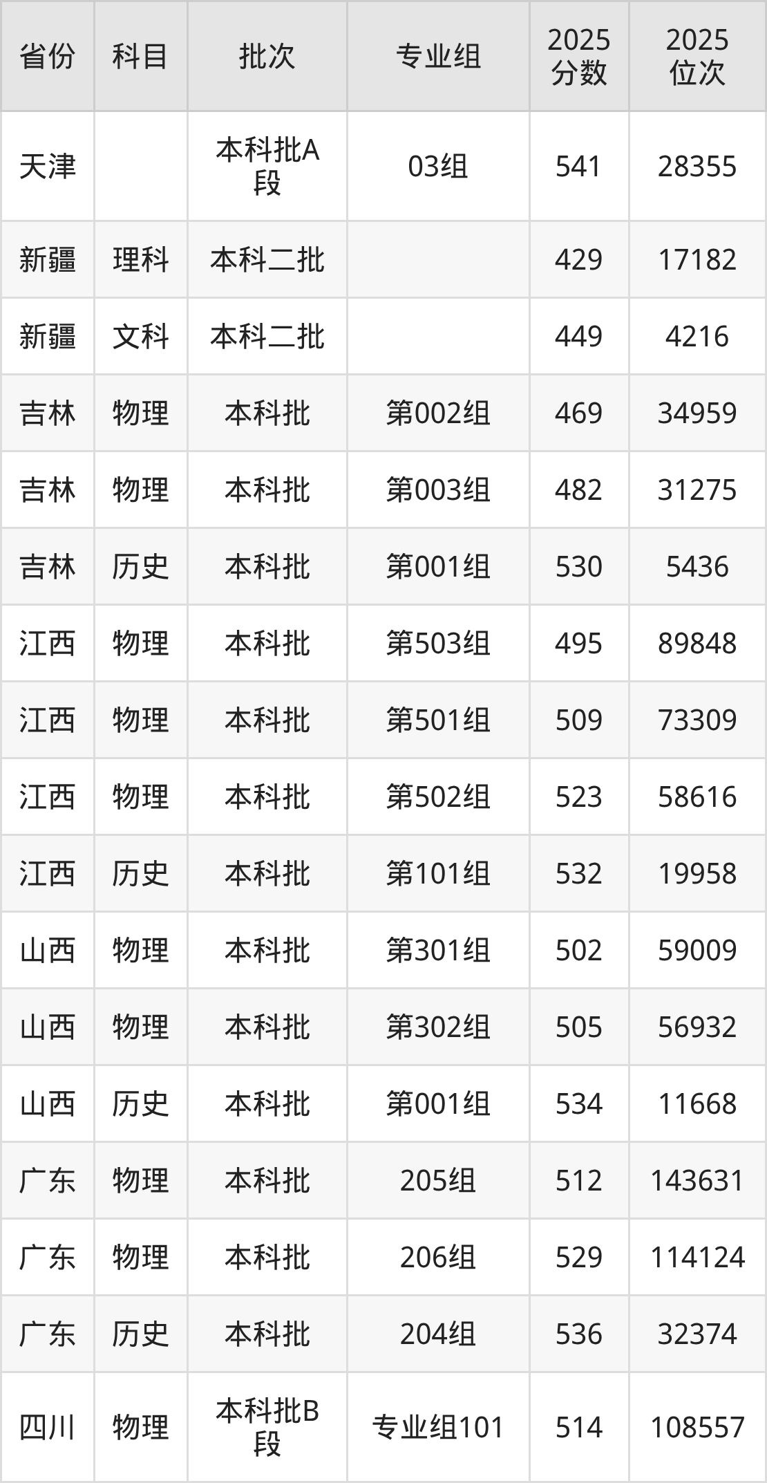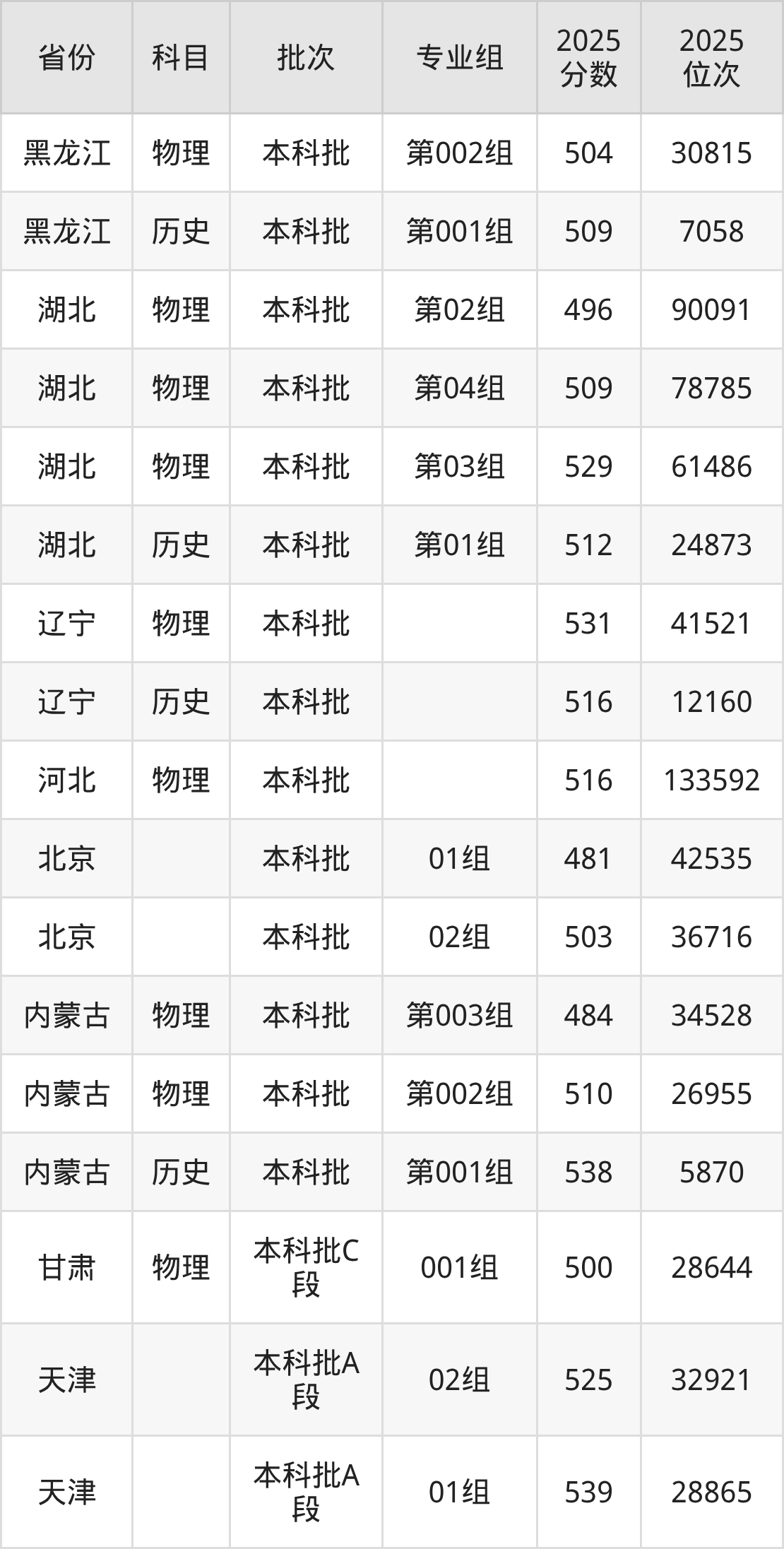 2025年在本科物理类进行招生,各专业组分数线详情如下: