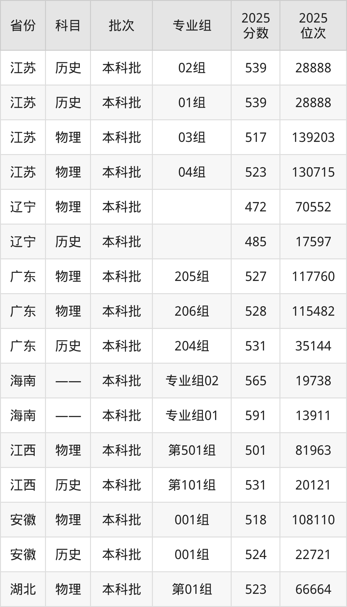 2025年在本科物理类进行招生,各专业组分数线详情如下:
