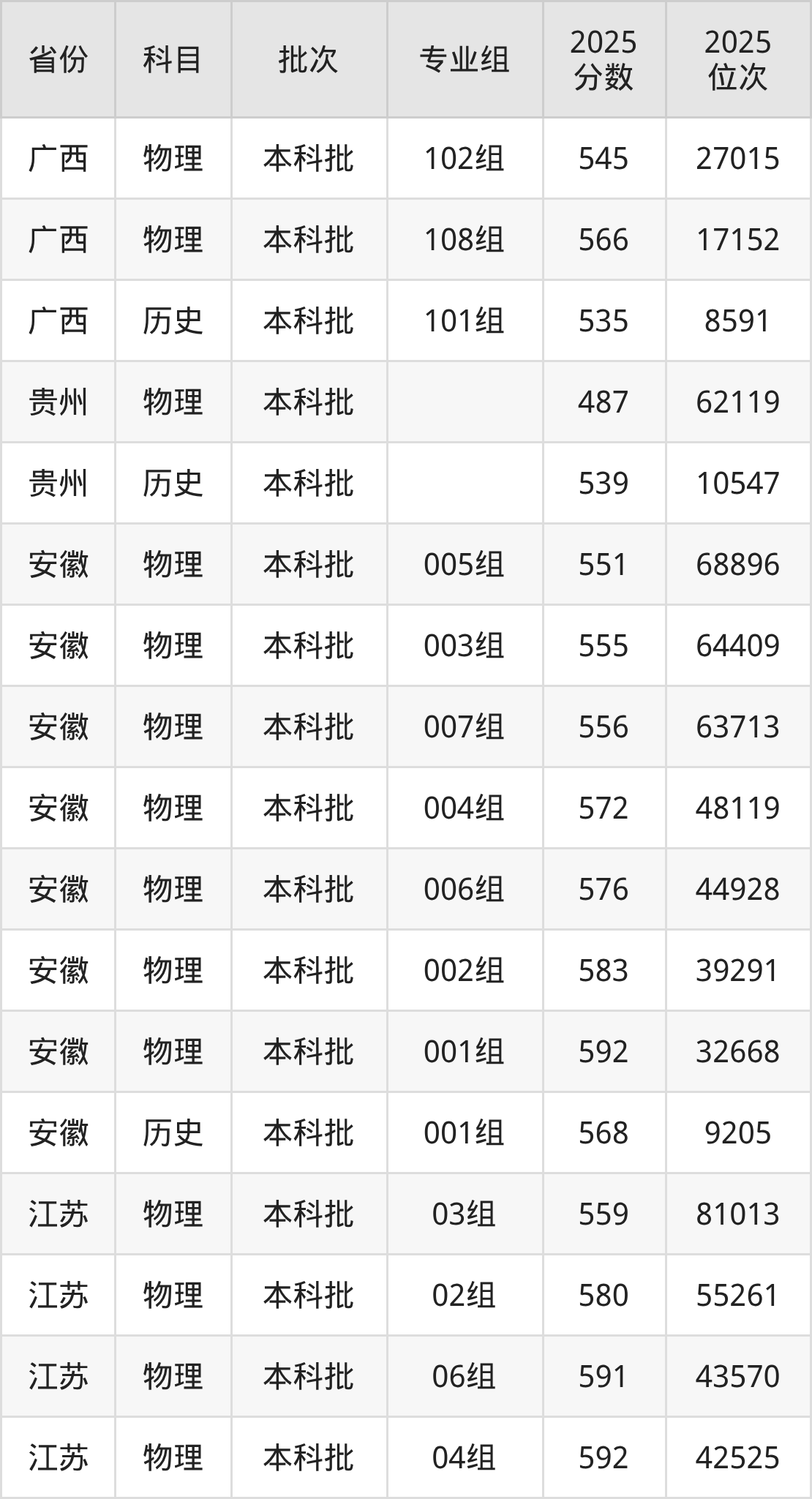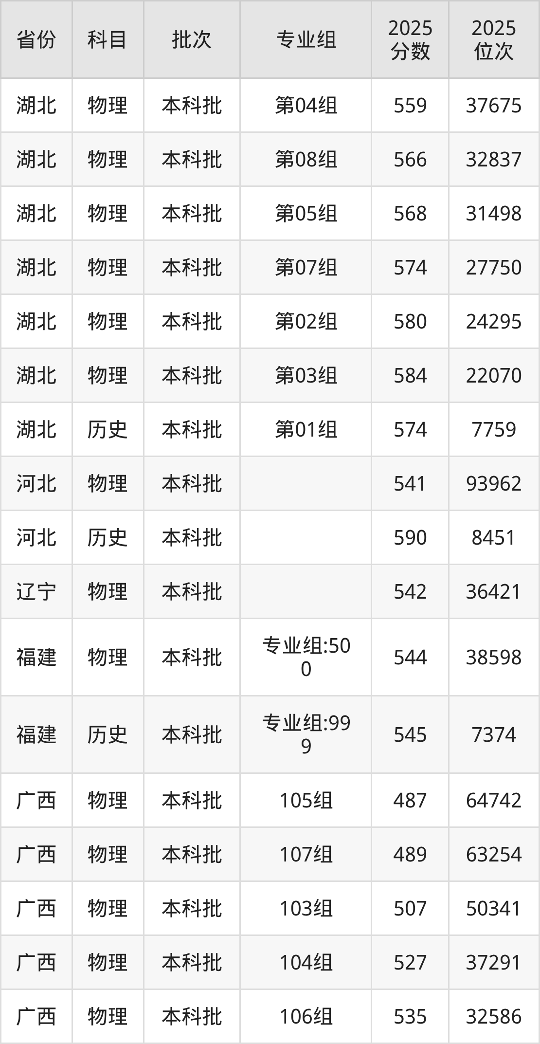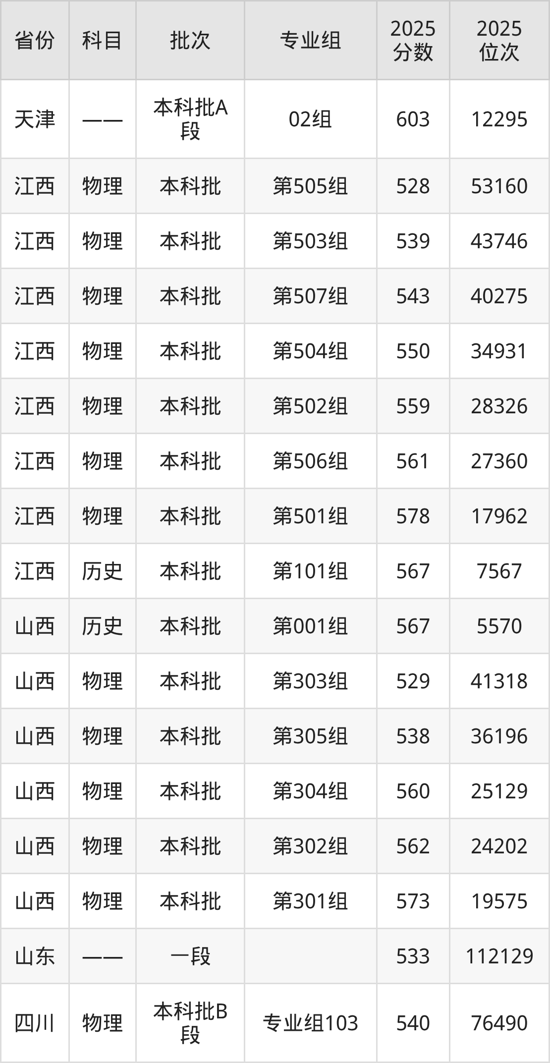 2025年在本科物理类进行招生,各专业组分数线详情如下: