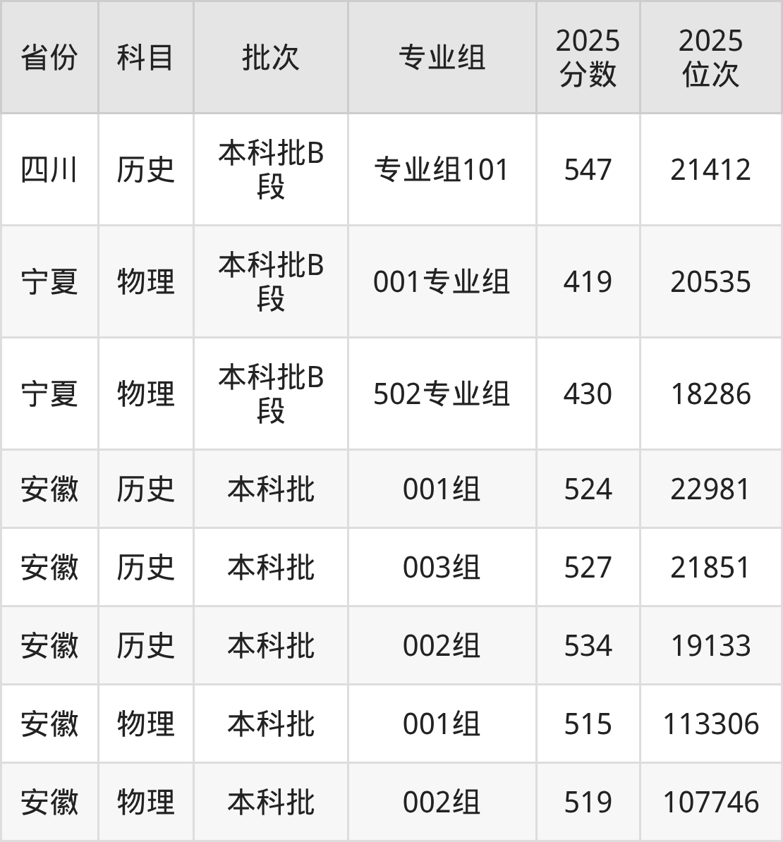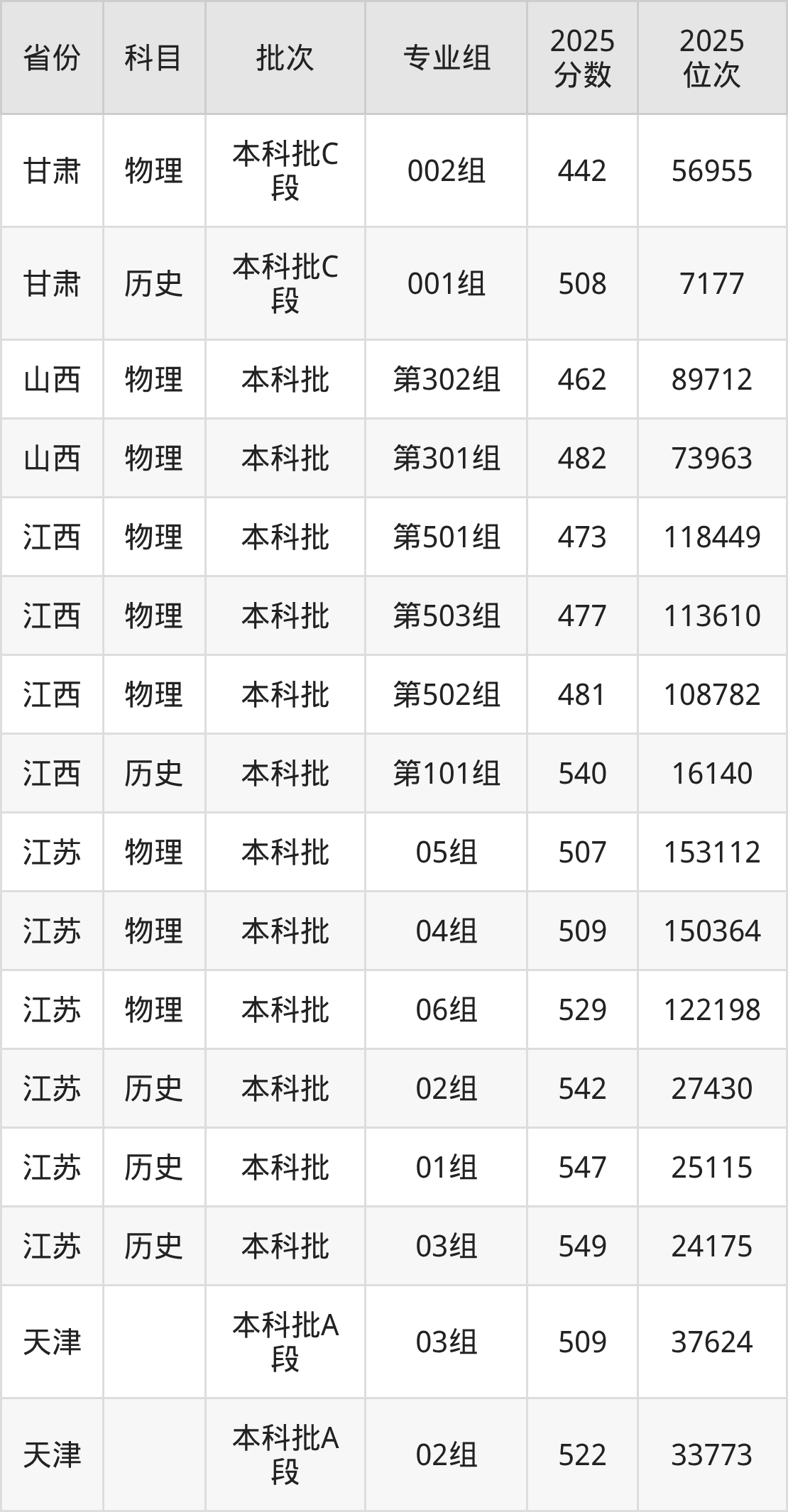 2025年在本科物理类进行招生,各专业组分数线详情如下: