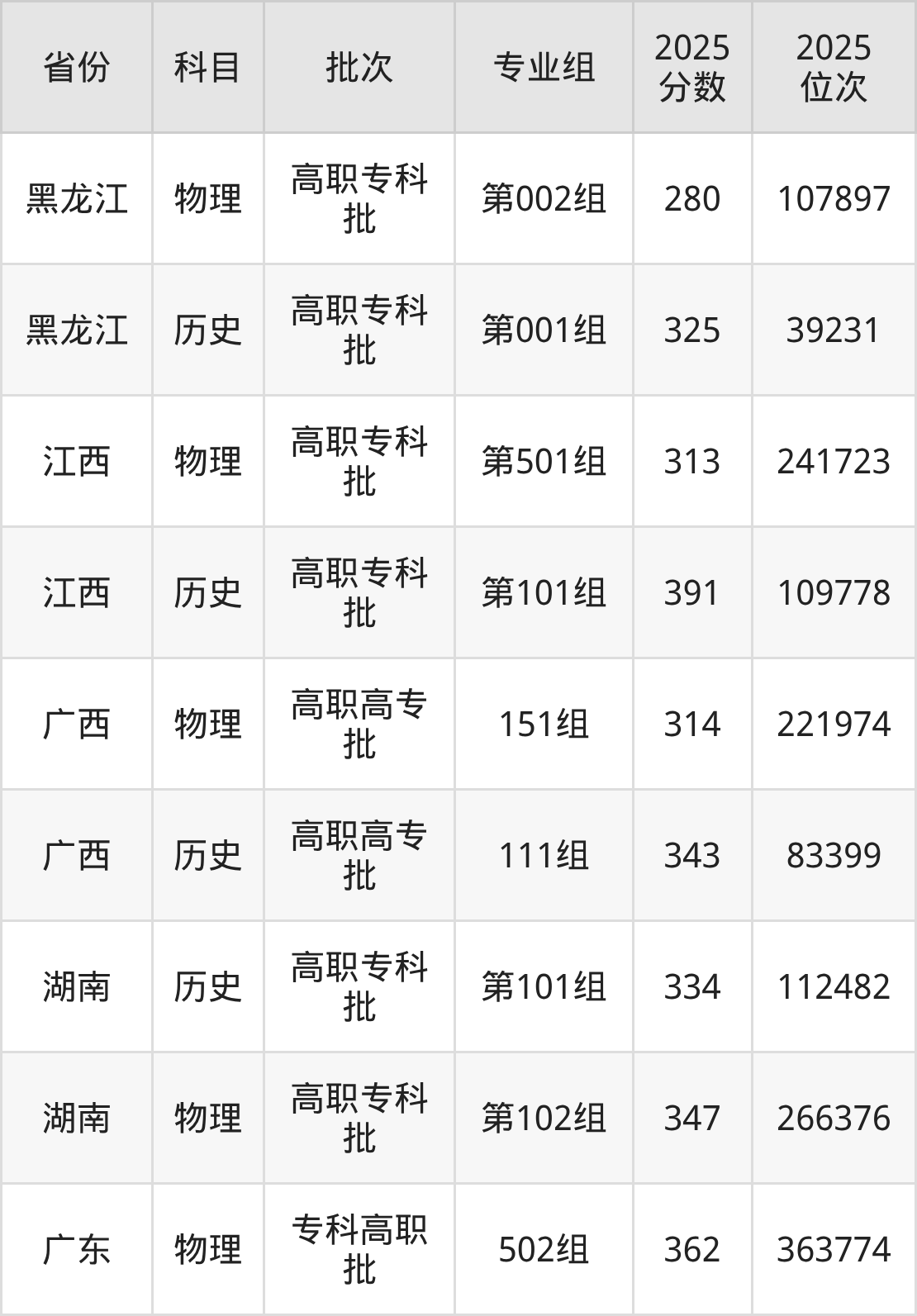 2025年在专科物理类进行招生,各专业组分数线详情如下: