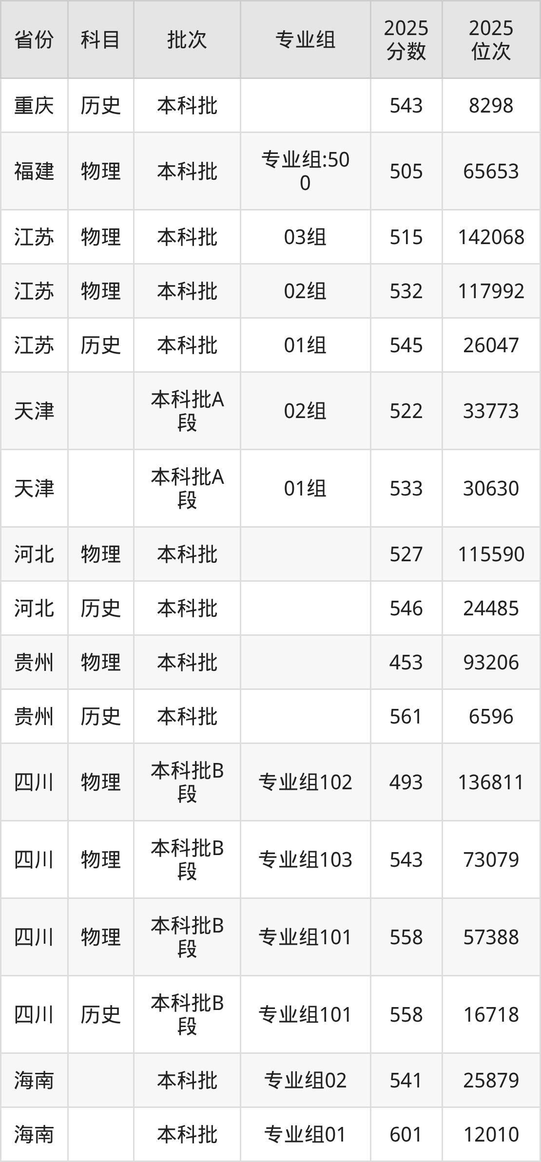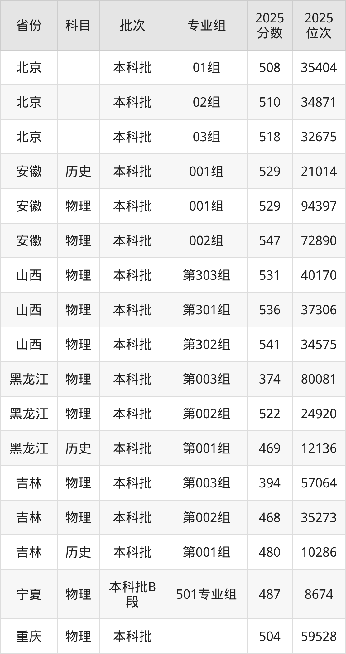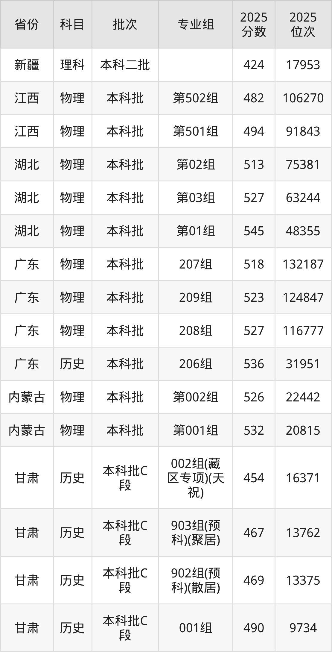 2025年在本科物理类进行招生,各专业组分数线详情如下: