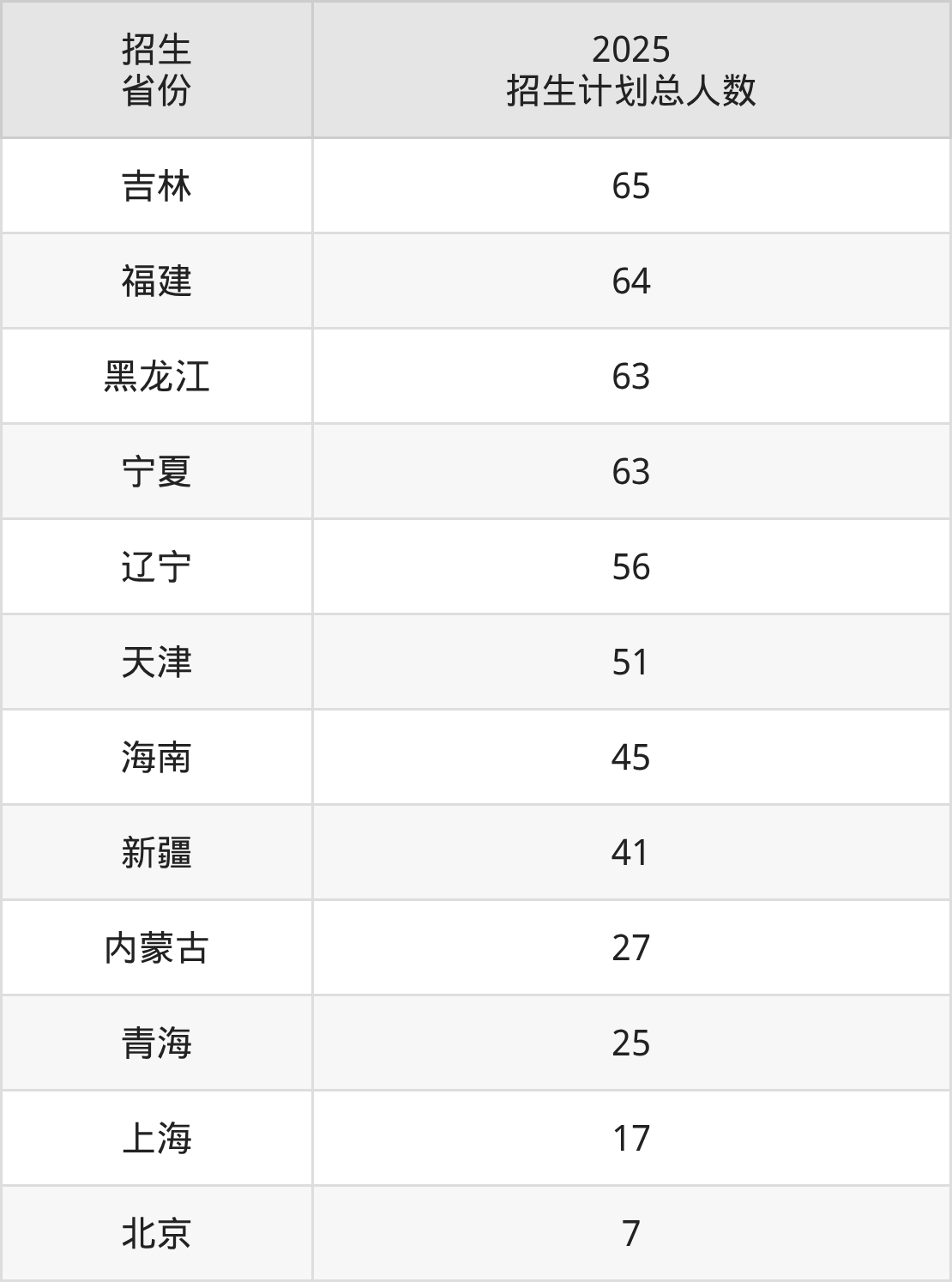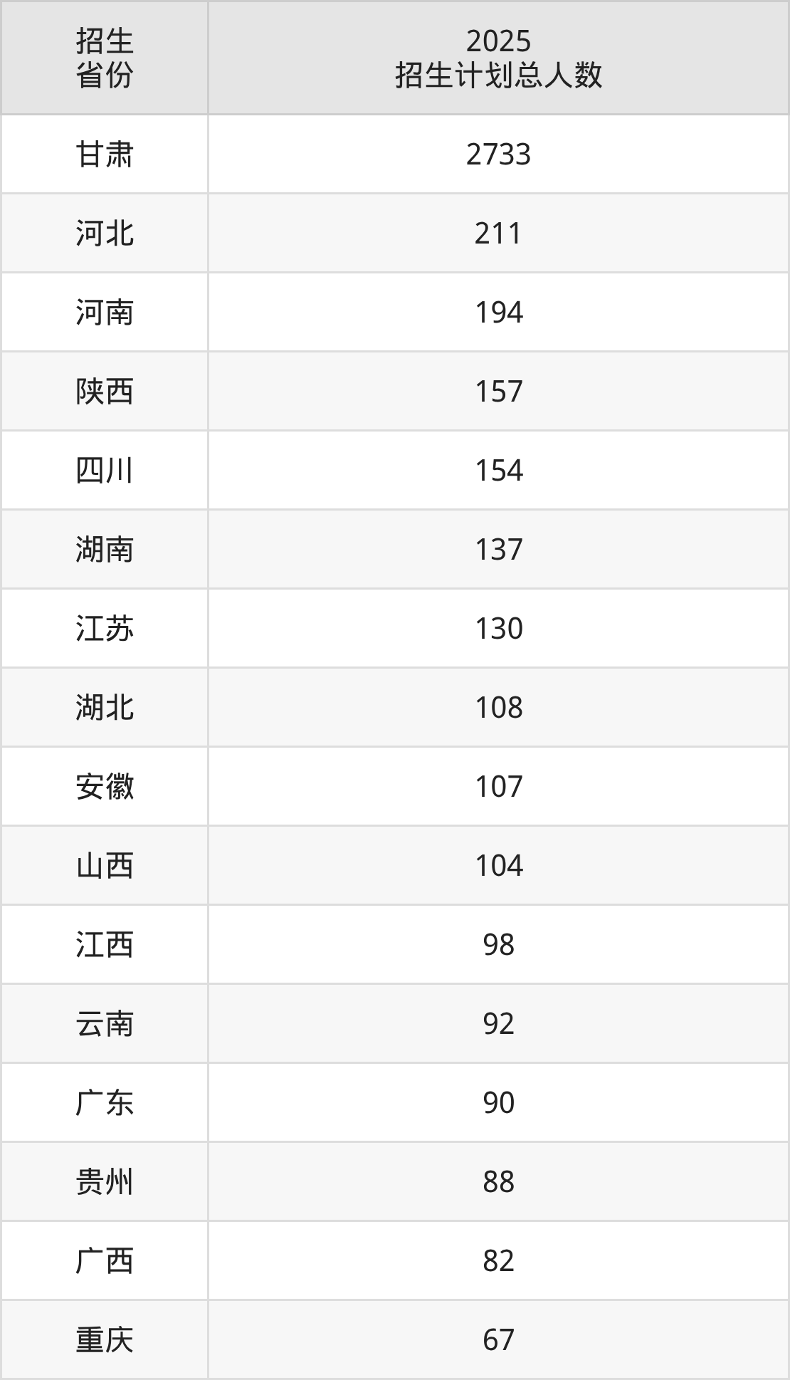 2025年兰州理工大学面向全国28个省市开展本科招生;招生专业共61个,招生人数共5076人。2025年在甘肃省招生计划总人数是2733人,其中,兰州理工大学在甘肃省招生人数最多的是机械设计制造及其自动化。兰州理工大学在各省具体招生人数情况如下表。