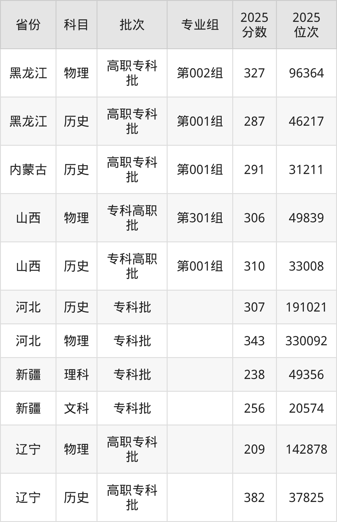 普通类专科历史类最低382分,专科物理类最低209分