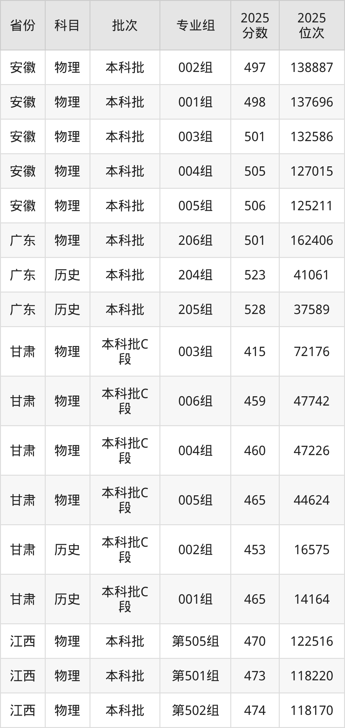 2025年投档录取最低分为450分,录取最低位次为96631名。