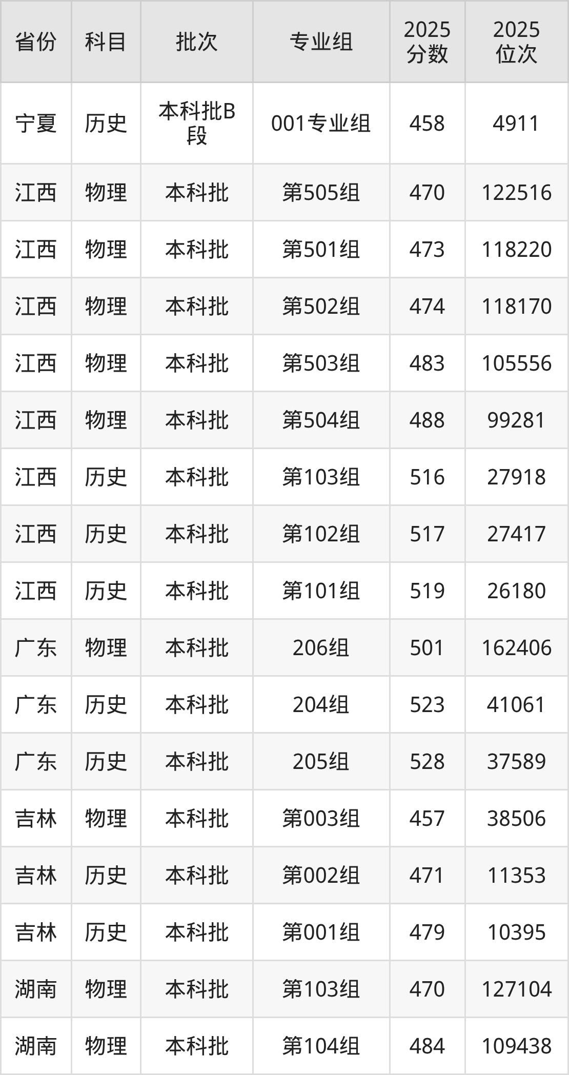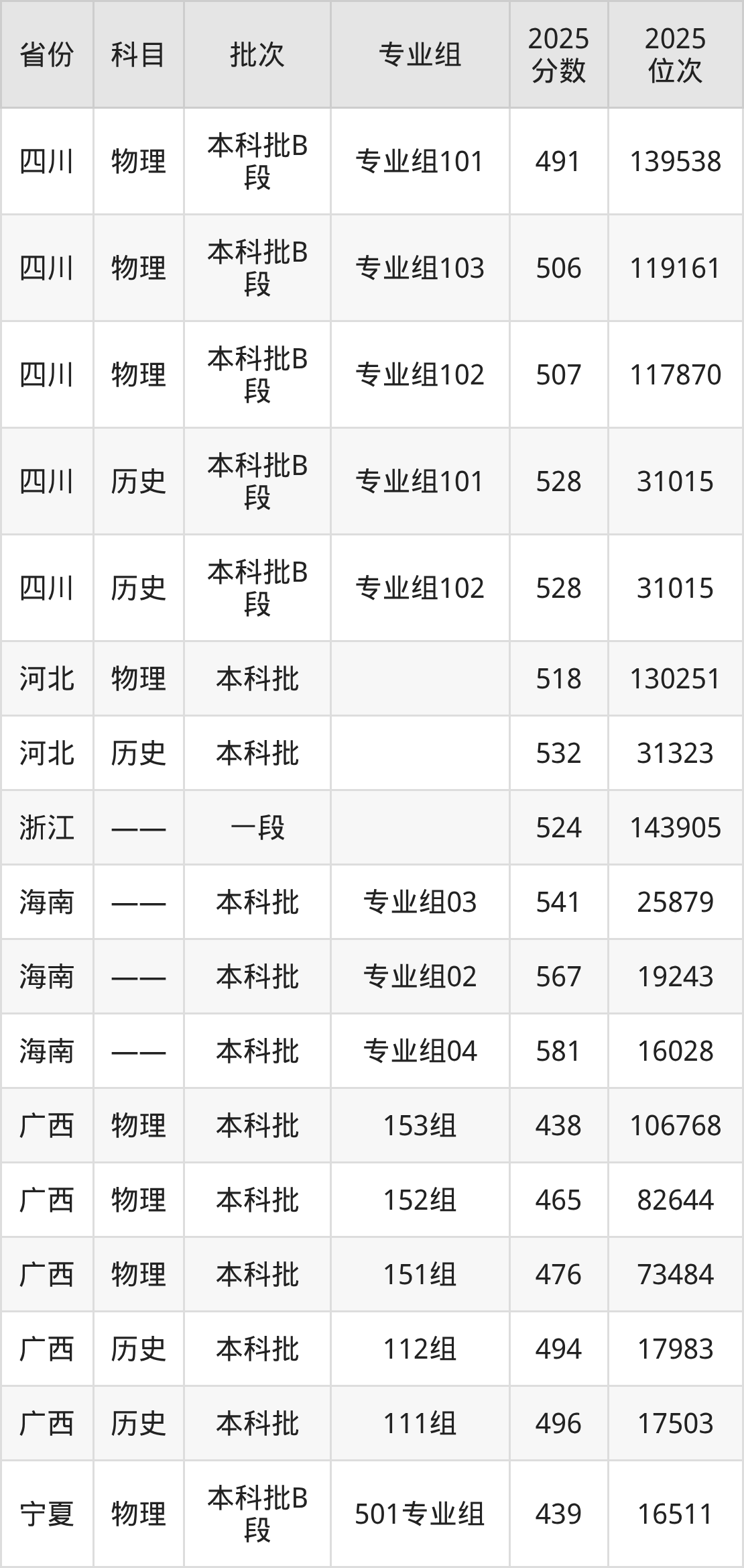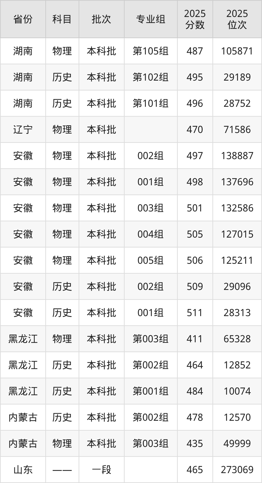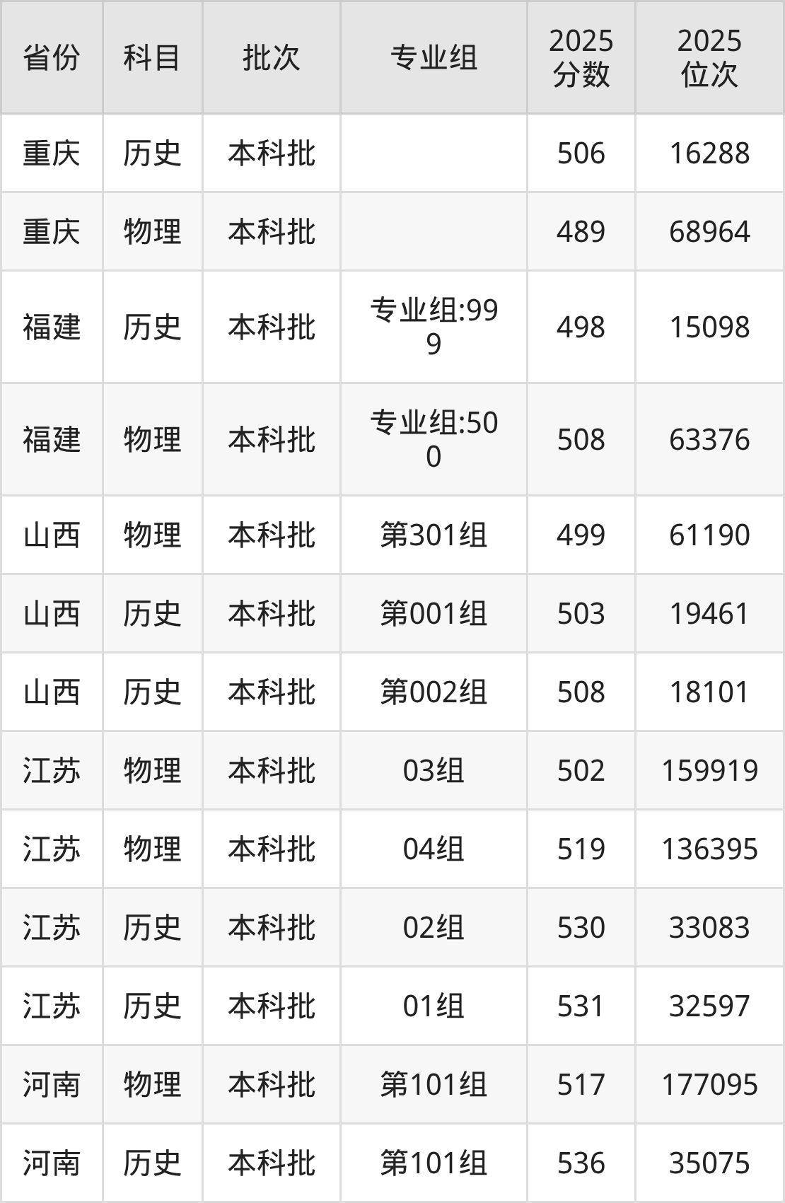 2025年在本科物理类进行招生,各专业组分数线详情如下: