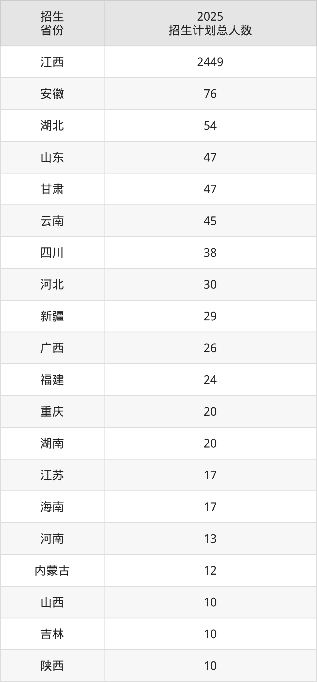 2025年新余学院面向全国26个省市开展本科招生;招生专业共30个,招生人数共3047人。2025年在江西省招生计划总人数是2449人,其中,新余学院在江西省招生人数最多的是新能源科学与工程。新余学院在各省具体招生人数情况如下表。