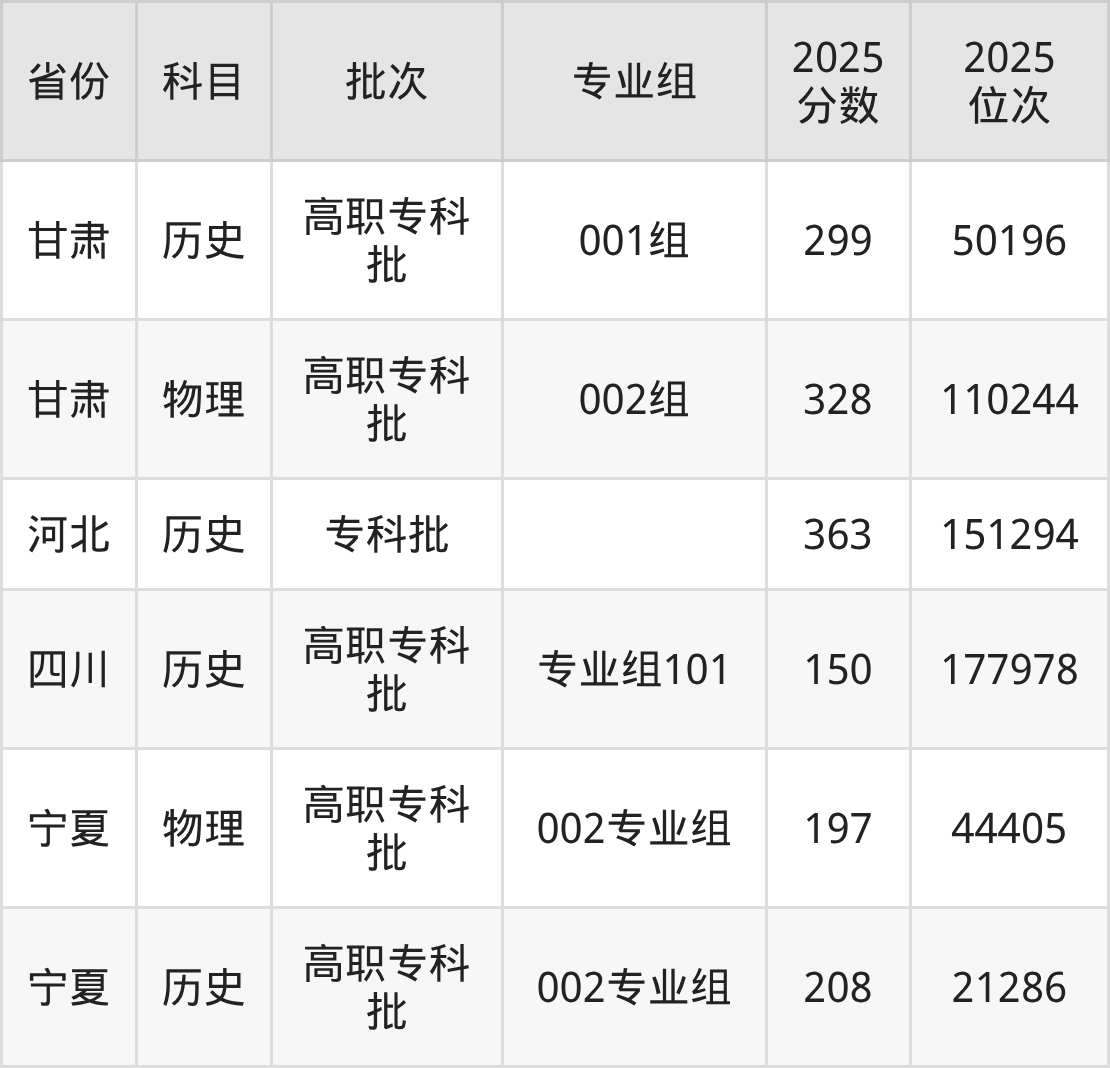 2025年在专科历史类进行招生,各专业组分数线详情如下: