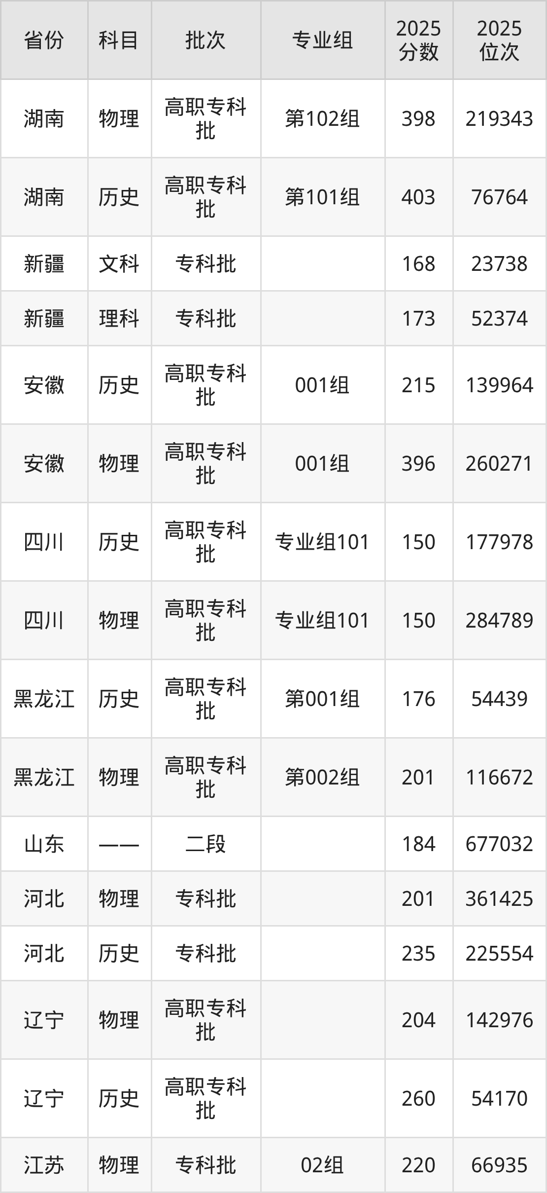 2025年曹妃甸职业技术学院全国录取分数线是150分到403分,录取最低在四川历史类(专业组101)、录取最高在湖南历史类(第101组)。各省各专业组最低分具有差异,详情如下: