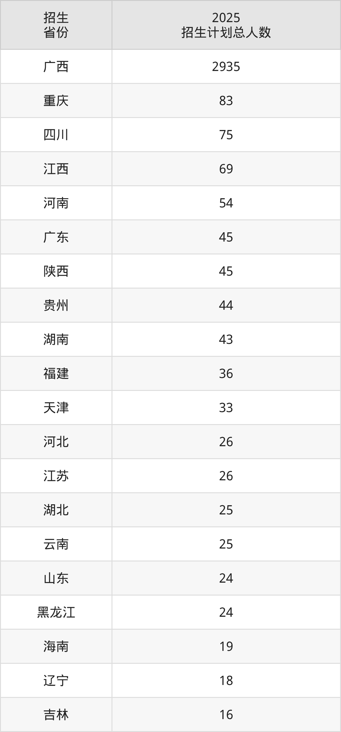 2025年广西科技师范学院面向全国21个省市开展本科招生;招生专业共32个,招生人数共3677人。2025年在广西壮族自治区招生计划总人数是2935人,其中,广西科技师范学院在广西壮族自治区招生人数最多的是数学与应用数学。广西科技师范学院在各省具体招生人数情况如下表。