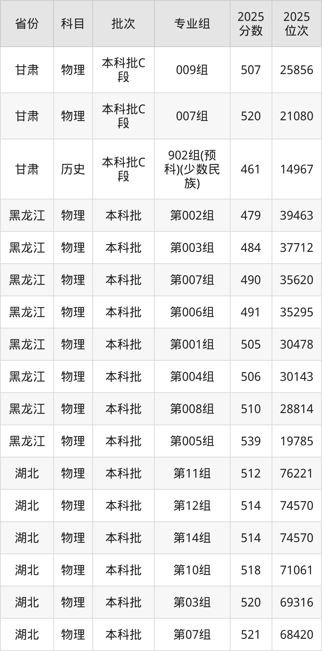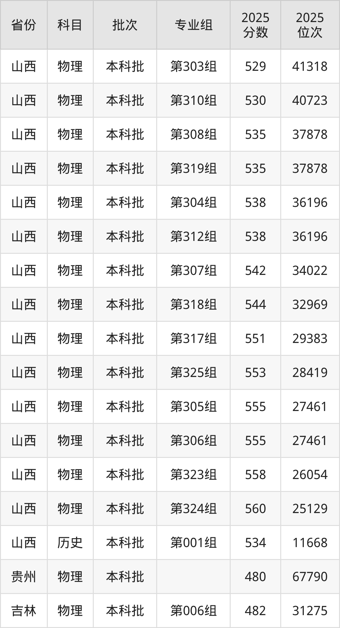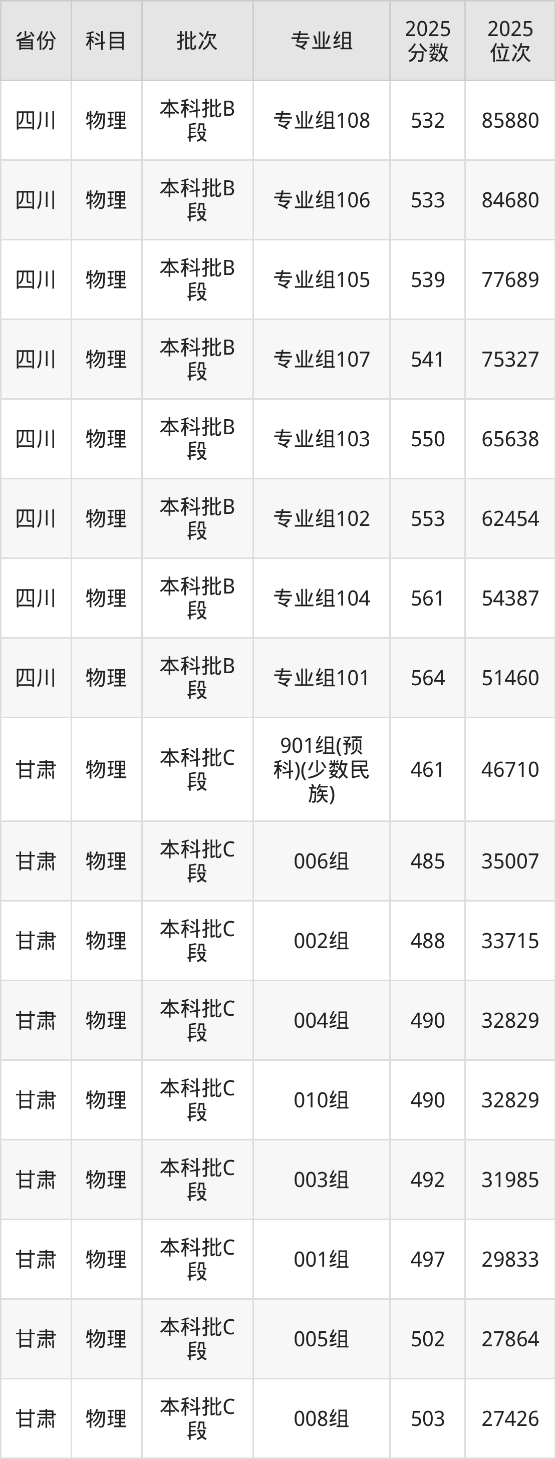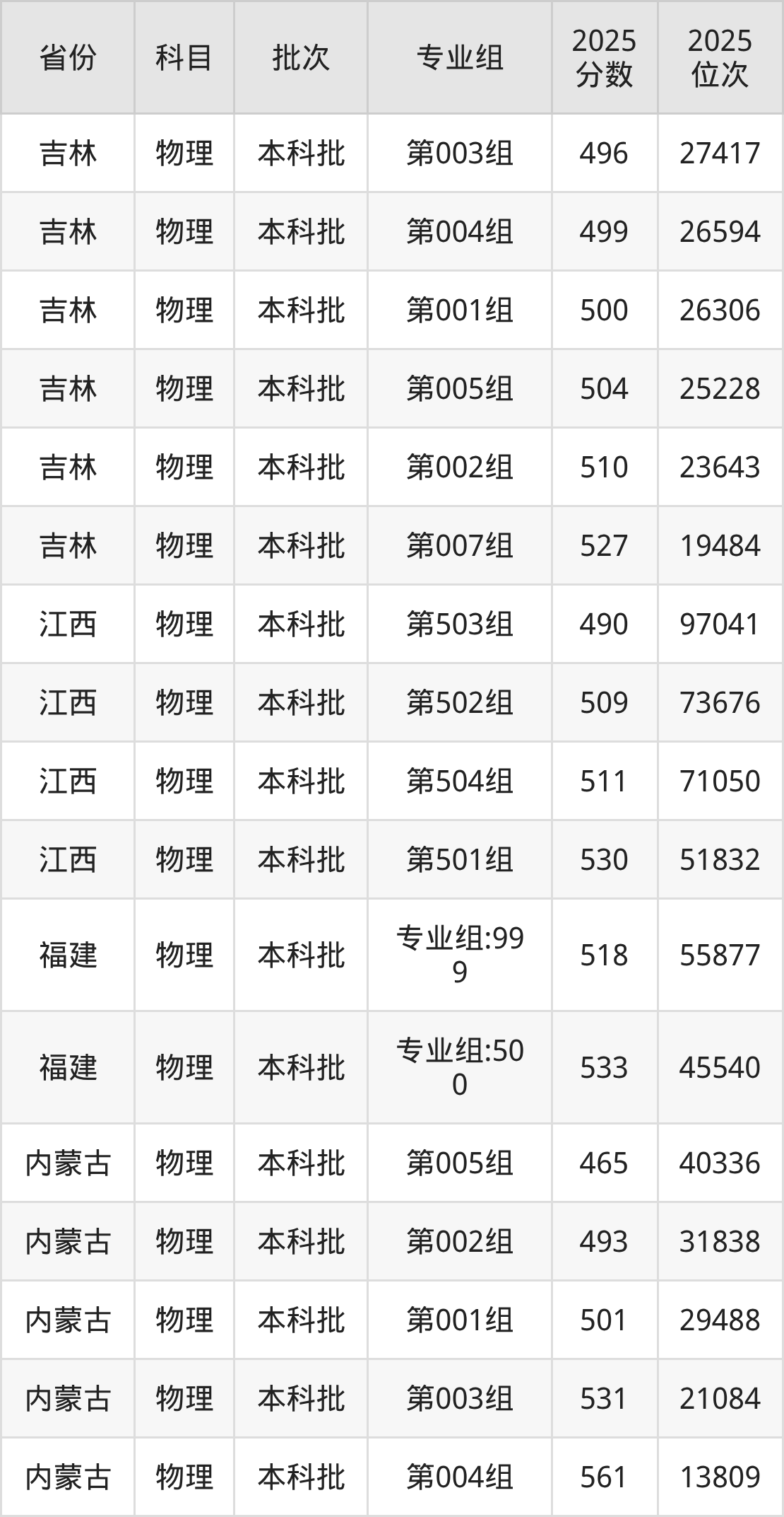 2025年在本科物理类进行招生,各专业组分数线详情如下: