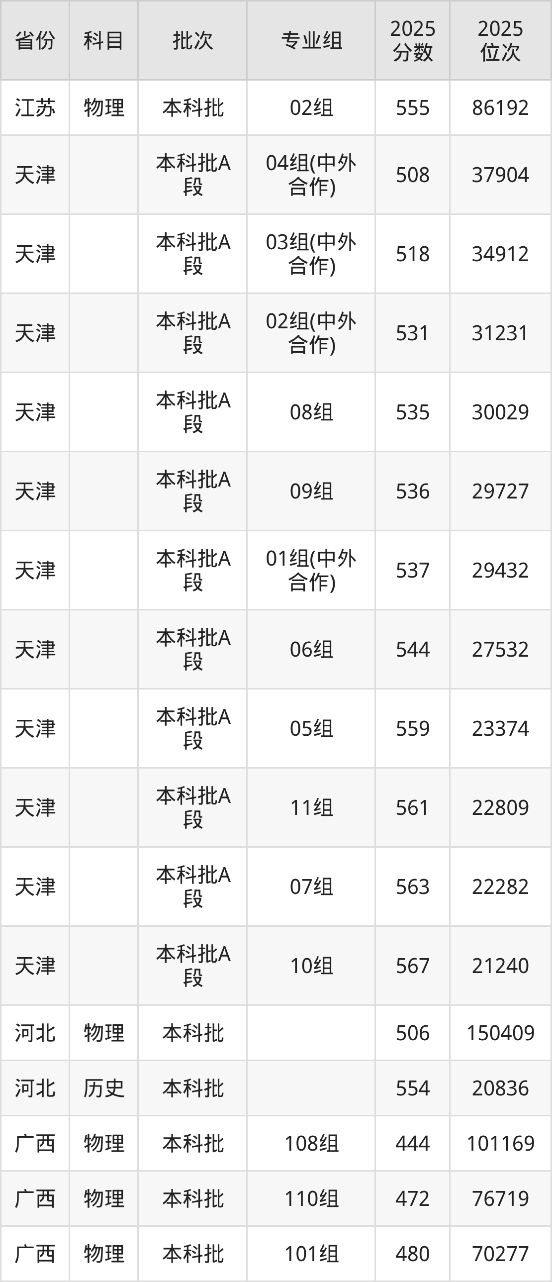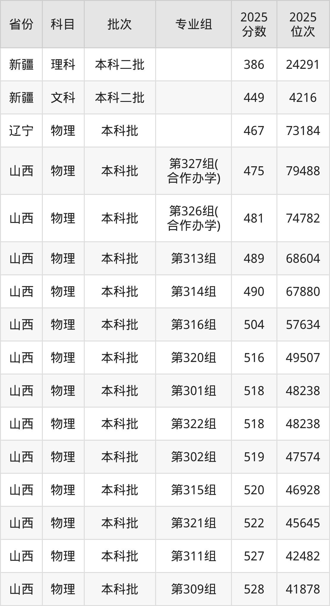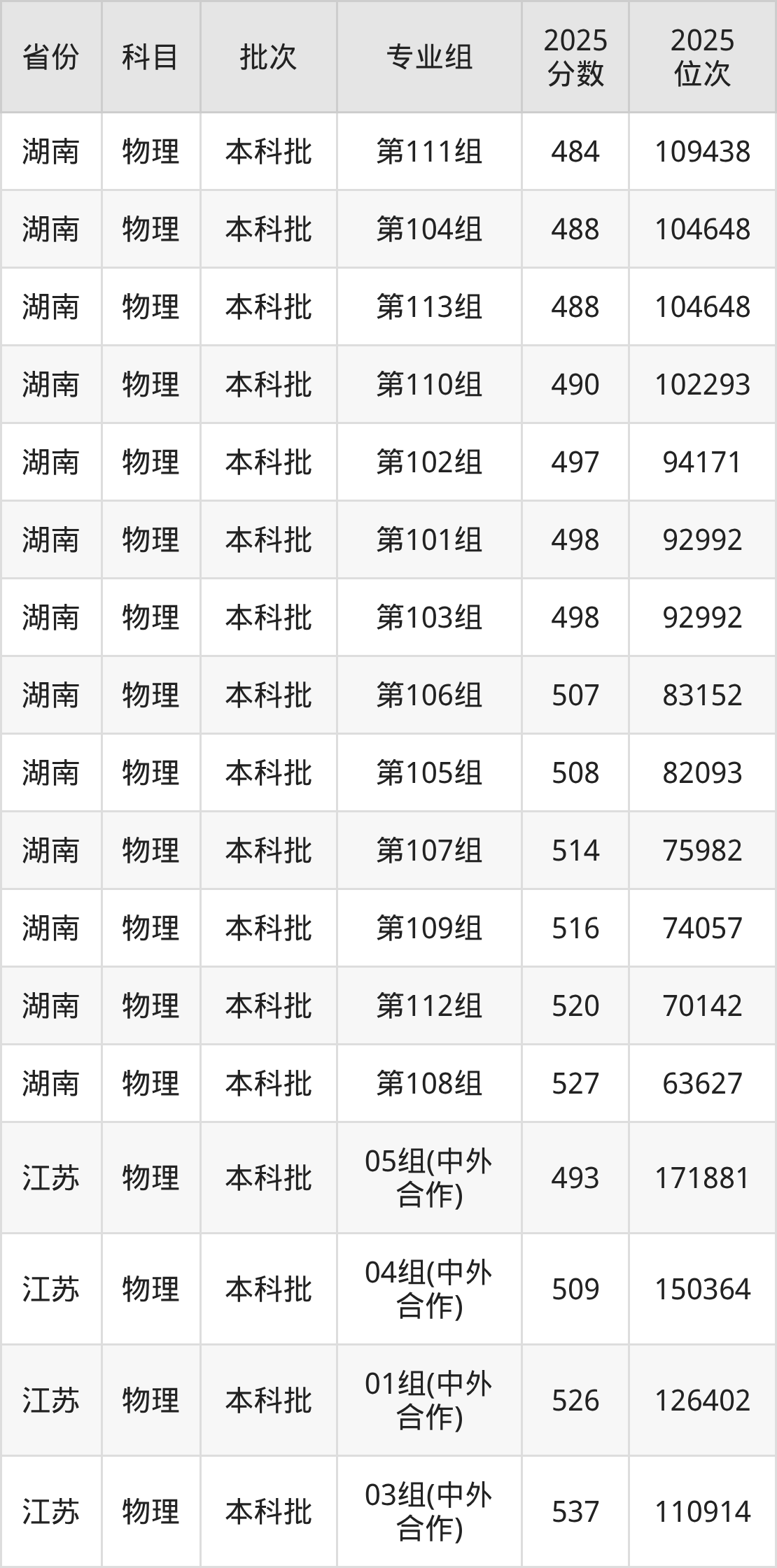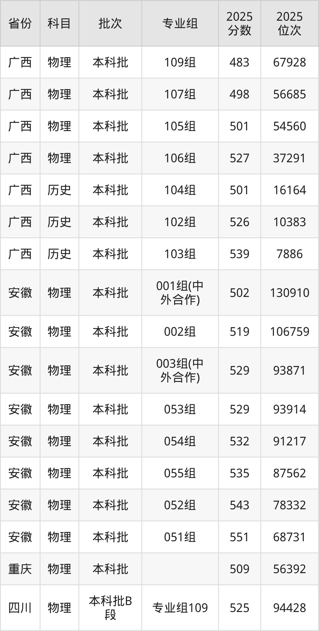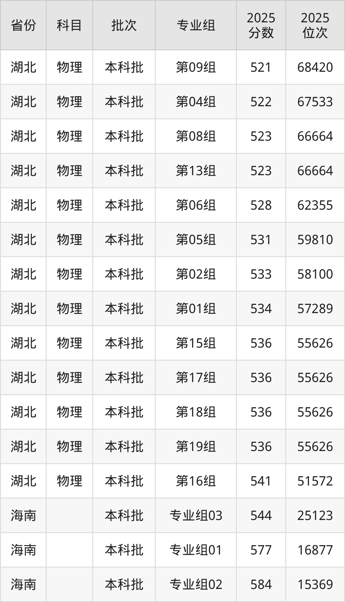 2025年在本科物理类进行招生,各专业组分数线详情如下:
