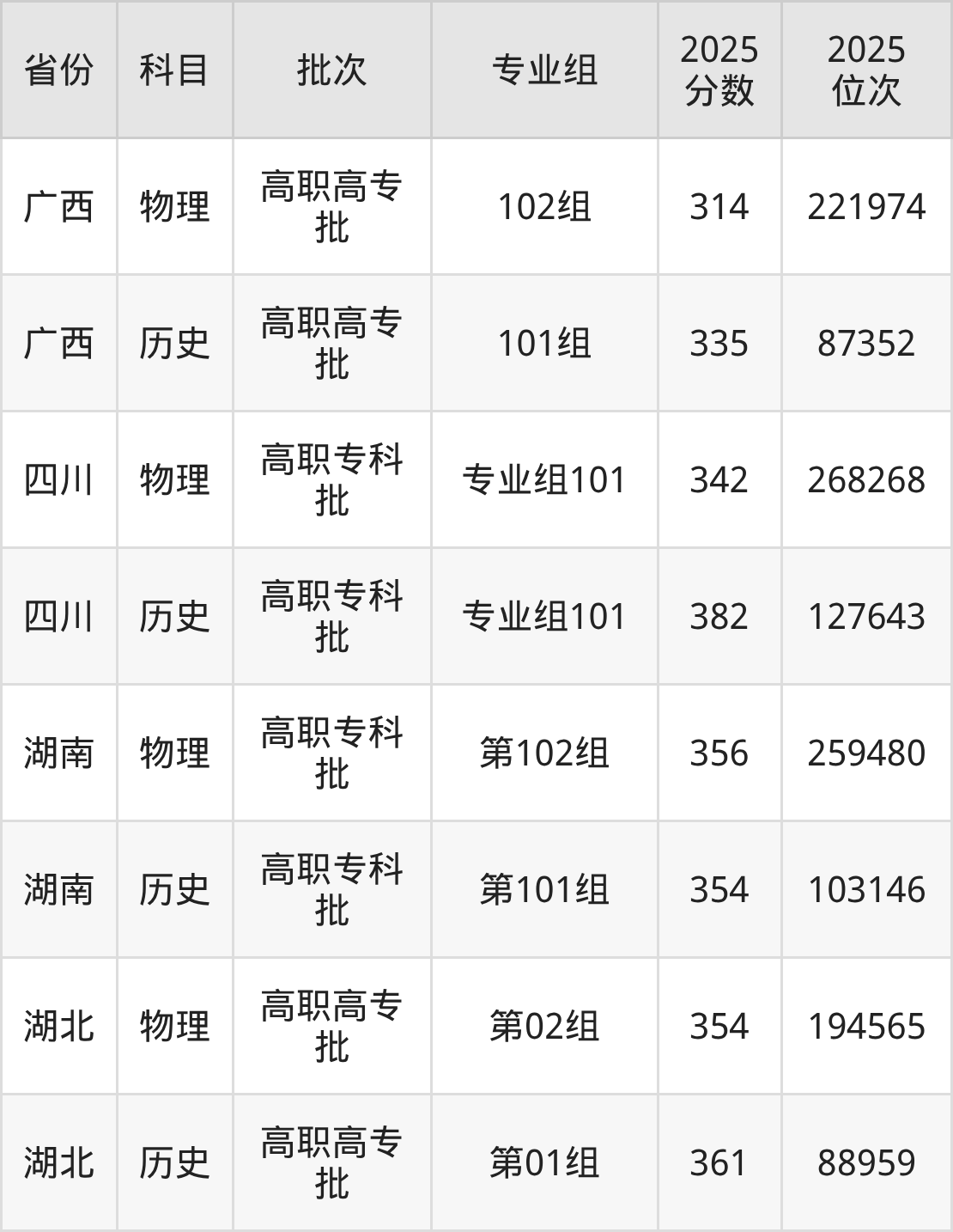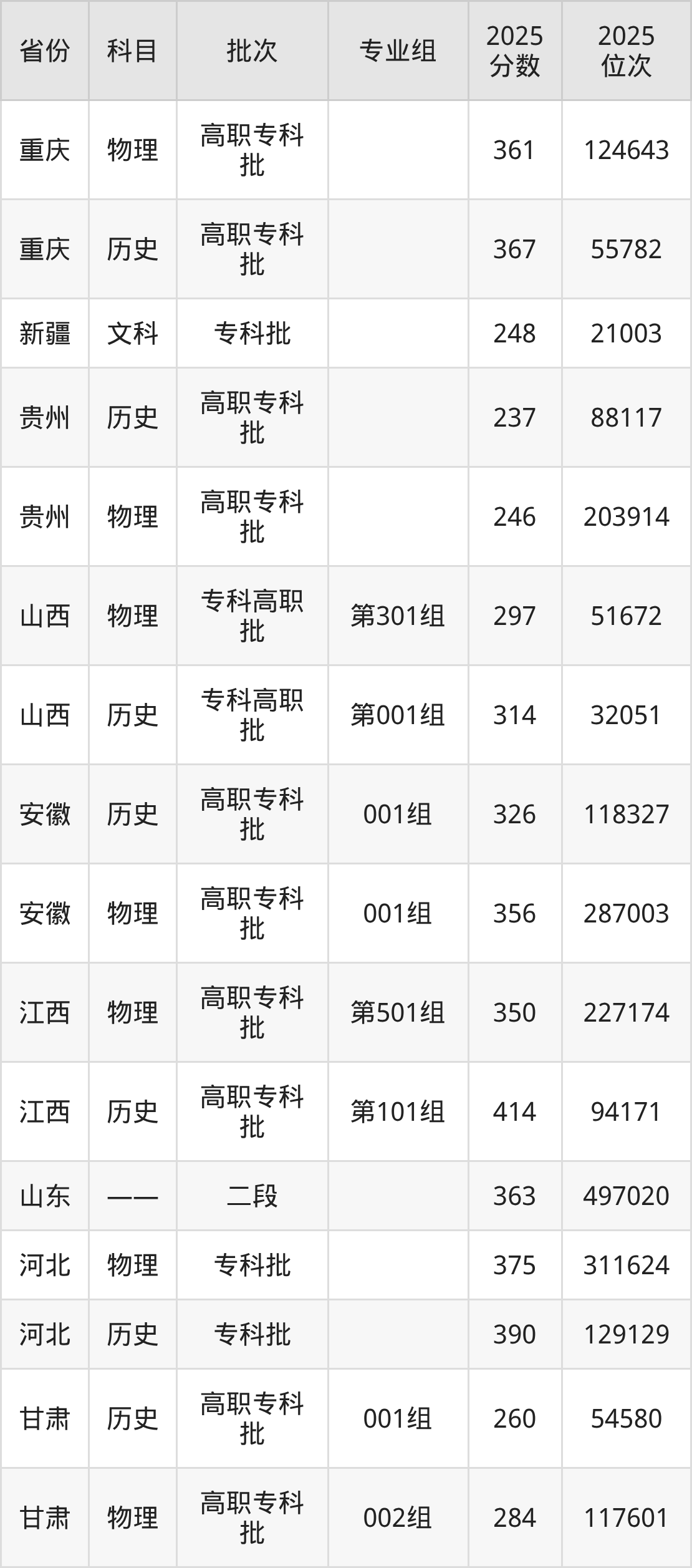 普通类专科历史类最低382分,专科物理类最低342分