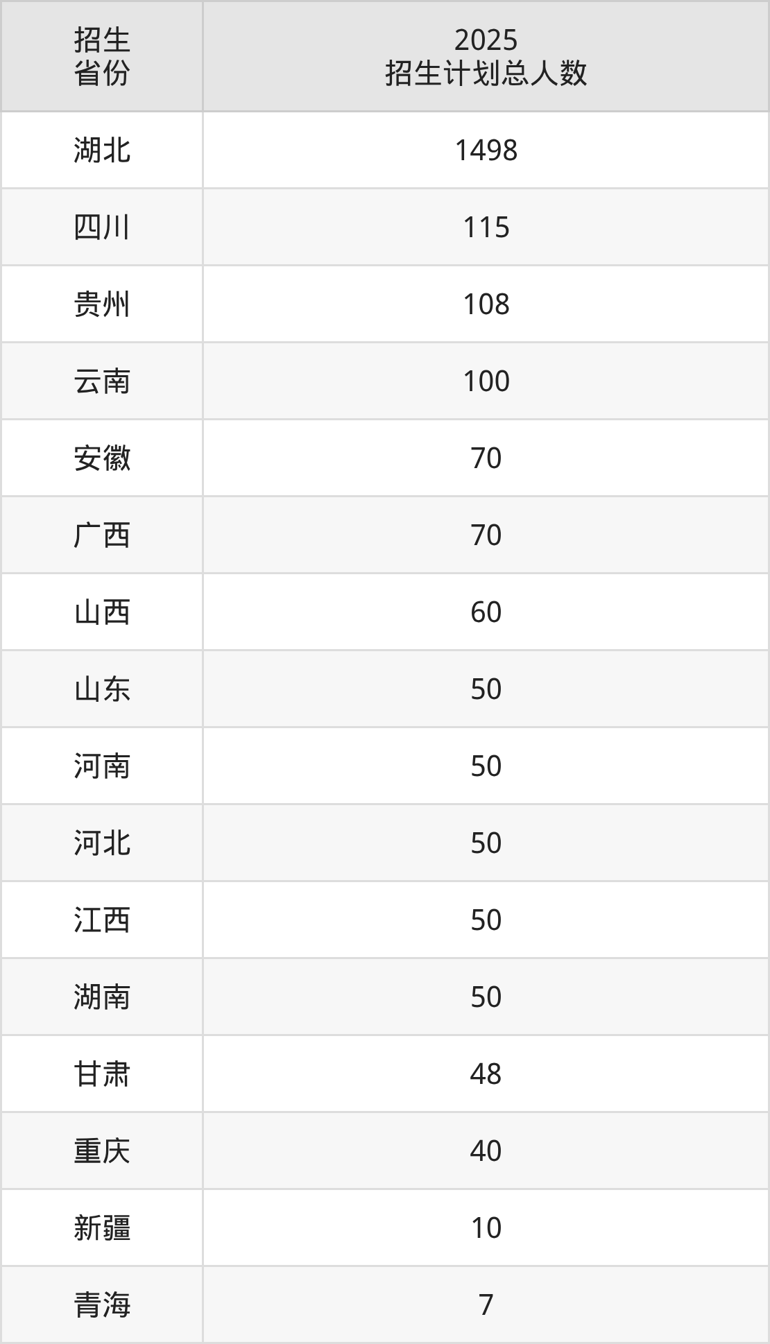 2025年三峡旅游职业技术学院面向全国16个省市开展专科招生;招生专业共39个,招生人数共2376人。2025年在湖北省招生计划总人数是1498人,其中,三峡旅游职业技术学院在湖北省招生人数最多的是大数据与会计。三峡旅游职业技术学院在各省具体招生人数情况如下表。