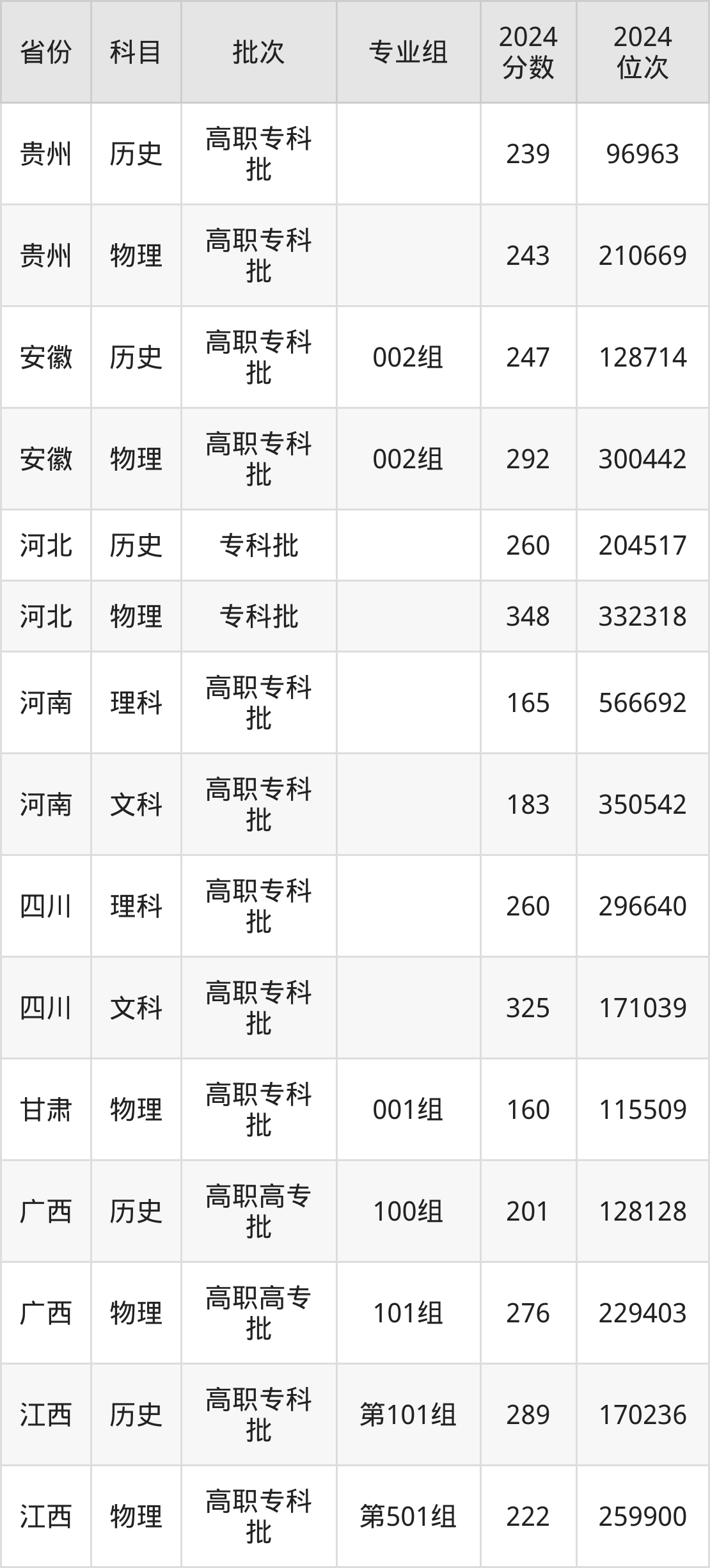 2024年在专科物理类进行招生,各专业组分数线详情如下: