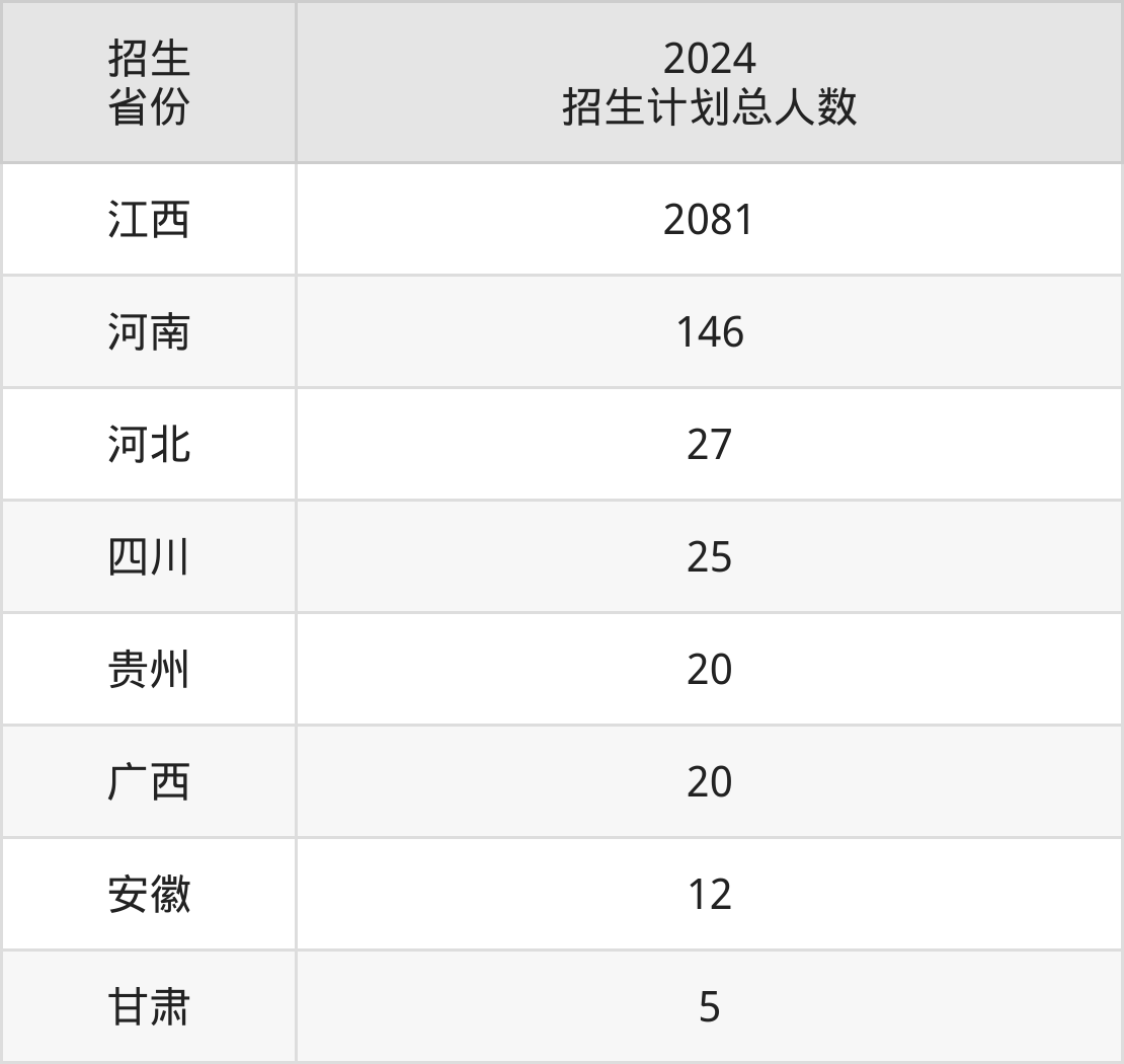 2024年共青科技职业学院面向全国8个省市开展专科招生;招生专业共37个,招生人数共2336人。2024年在江西省招生计划总人数是2081人,其中,共青科技职业学院在江西省招生人数最多的是护理。共青科技职业学院在各省具体招生人数情况如下表。