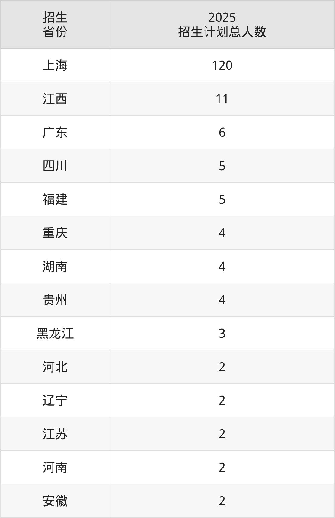 2025年上海视觉艺术学院面向全国14个省市开展本科招生;招生专业共3个,招生人数共172人。2025年在上海市招生计划总人数是120人,其中,上海视觉艺术学院在上海市招生人数最多的是文化产业管理。上海视觉艺术学院在各省具体招生人数情况如下表。