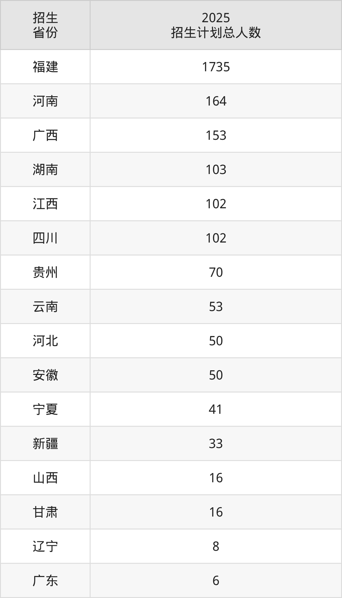 2025年福建商学院面向全国24个省市开展本科招生;招生专业共39个,招生人数共2721人。2025年在福建省招生计划总人数是1735人,其中,福建商学院在福建省招生人数最多的是数据科学与大数据技术。福建商学院在各省具体招生人数情况如下表。