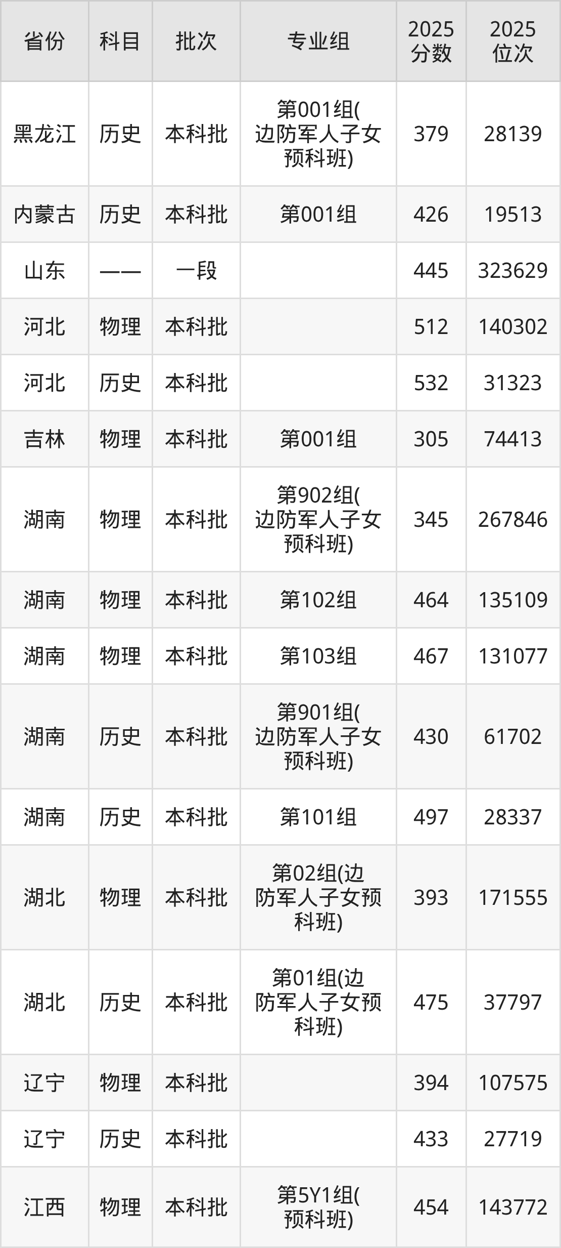 边防军人子女预科:2025年投档录取最低分为387分。