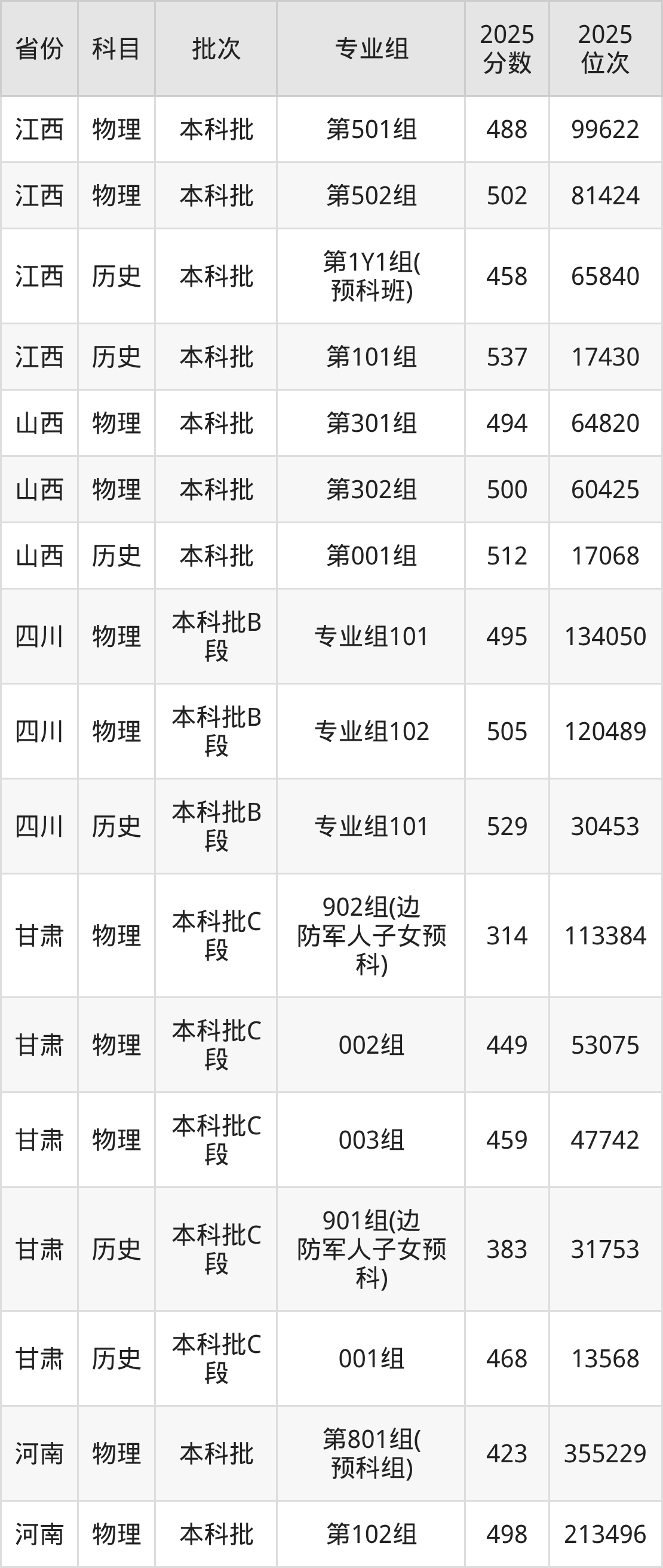 普通类本科物理类最低362分,本科历史类最低457分